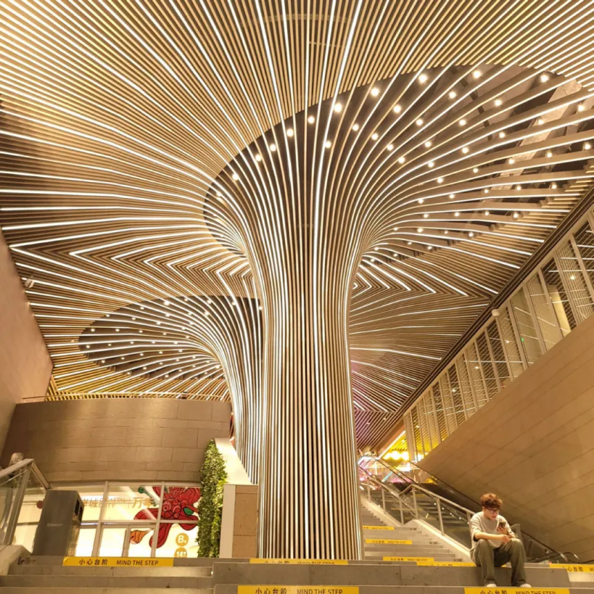 在具体设计呈现上,项目围绕建筑外立面、天际线、空间形态、主题街区及公园界面等场景进行系统化控制及打造。其中,双盒子mall与连廊体系在夜幕下呈现出鲜明的悬浮感与未来感;“巨树天阶”通过立柱内部线性光设计,营造出自然光穿透树冠的视觉效果;地下沉浸式空间“光与夜之谷”则通过镜面与灯光装置结合,构建出富有艺术张力的体验场景。