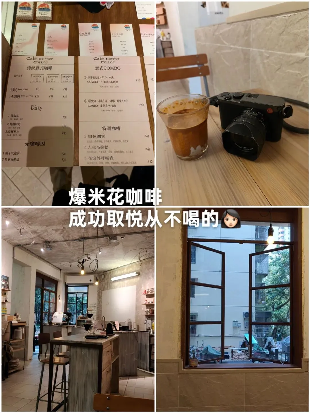 三天时间,深圳给我印象极好,没有辜负我对世界之巅的期待。周五下午去华侨创意园和华侨城拍了照,中途下雨期间去附近一家叫“平静角落”的咖啡馆,喝到了小有名气的爆米花dirty,成功征服从不喝咖啡的我。喝咖啡期间店里在放《情歌》,苦情歌听的有点烦正想找个人说说话,正好梁老板来感谢我给她和刘姐买酒,据说俩人喝完“孩子买的酒”之后睡的很爽,已经和好了。和梁老板一起扯了会犊子骂了会人,心情果然就好了。梁老板不愧是文人,骂人主打一个该高级高级,该粗俗粗俗,我佩服的五体投地。