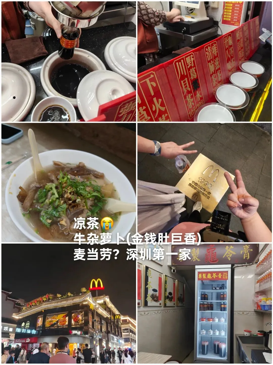 晚上回城里去了东门老街,荃儿:你不是想看老的地方嘛,这就是深圳最老的地方。我说我真的要看”老街”我不是要看最老的商圈...我俩一致认为这里和西塔很像,不过我认为还是更像北行。但其实老街并没有落寞,她依然热闹繁华,有很多地道小吃,也有繁华的商场,深圳真的到处都是商场。我们在老街吃了牛杂萝卜,荃儿的饮食习惯已经被广东人同化,她选择干吃,我还是一如既往重口,蒯了一勺沙茶酱沾着吃。金钱肚很好吃,白萝卜在牛肉汤里煮久了好吃的没边儿。吃完后荃儿带我打卡了深圳第一家麦当劳,然后一起去找拍罗湖三件套的机位。这种东西在地面拍肯定是不行的,我们根据小红书攻略找到一座大厦,上到30楼楼顶天台去拍照。可能我在北方已久,没怎么上过天台,非常的兴奋!上面其实很恐怖,晾了一大排白被单,被那天晚上的风吹的张牙舞爪到处乱飞。天台边缘用红色喷墨字写着“请勿靠近”等等字样,还有两个小隔间房子,总之还蛮恐怖,颇有悬疑小说案发现场的感觉。