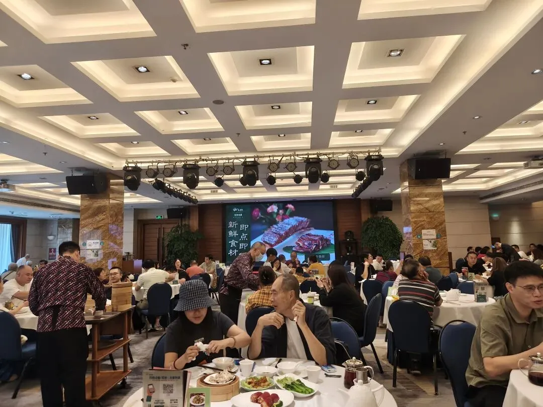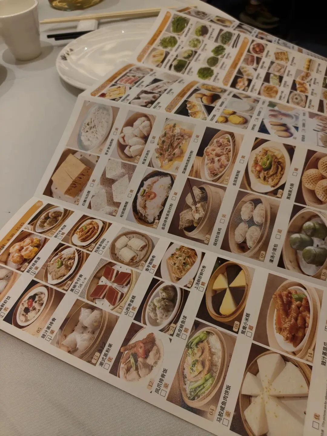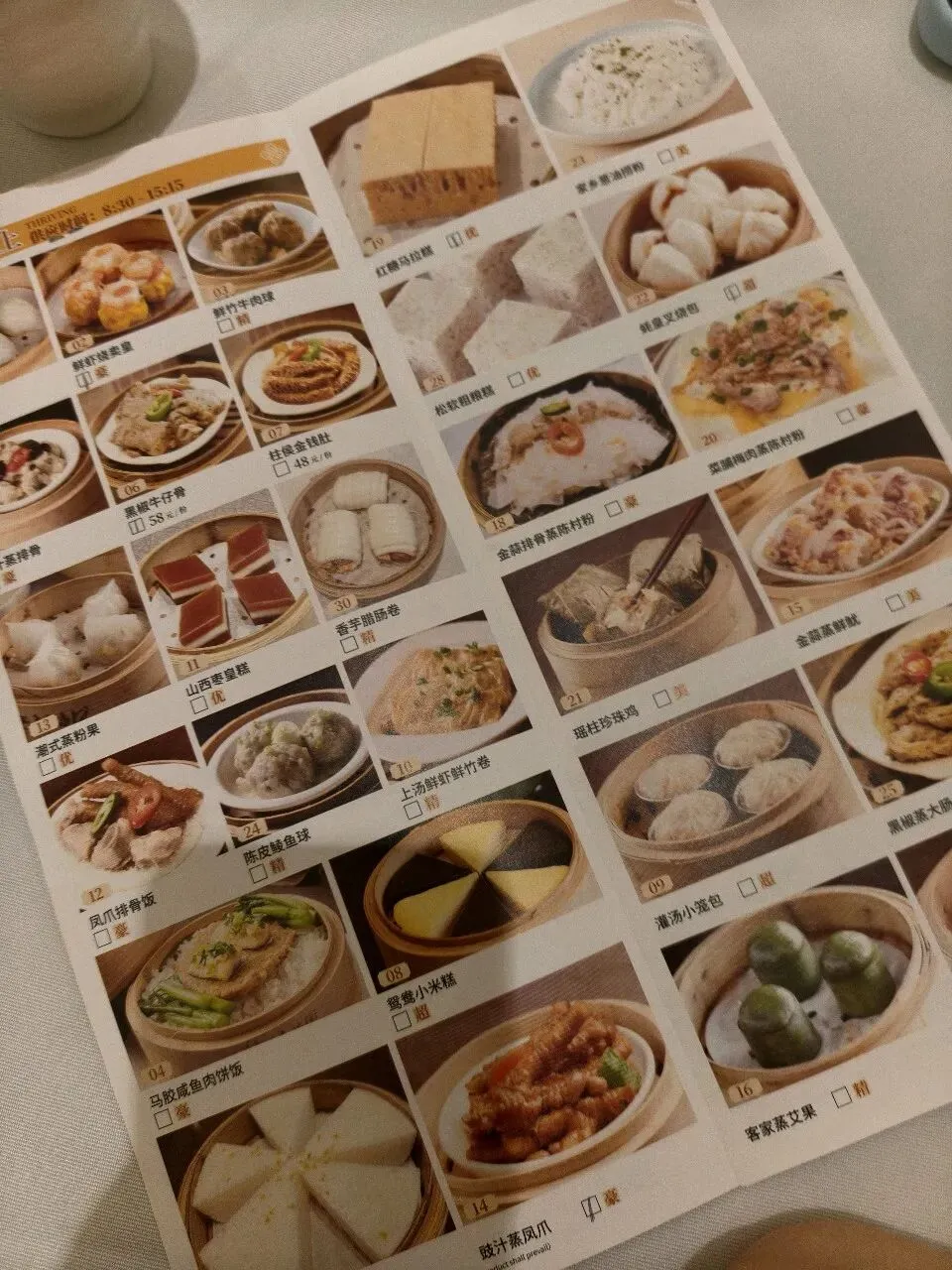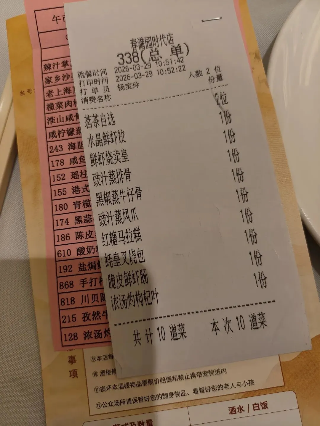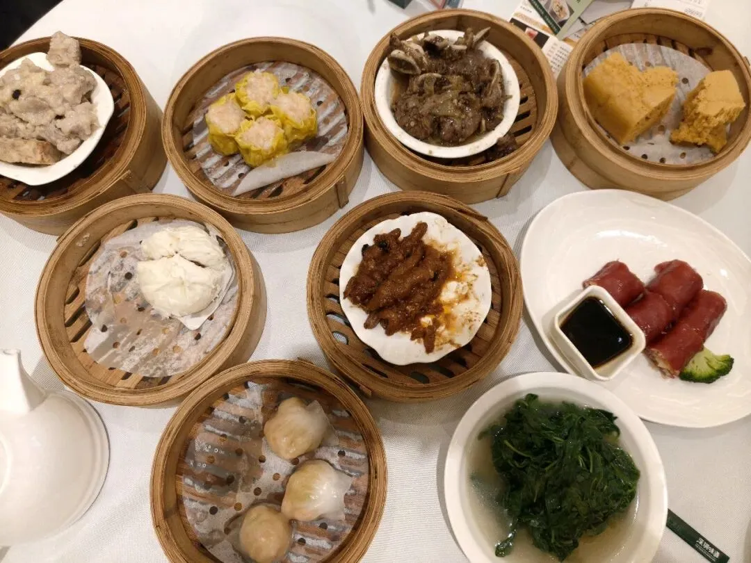我们这次选的店叫春满园,据范老师所说是深圳最正宗也是做的最好的广式早茶。和我想的不太一样,我以为的早茶是在室外,大家懒洋洋的坐在棚子里,旁边有个躺椅之类的,然后吃点心喝茶,但实际上的广式早茶是在一个类似于酒席大堂的地方,一个巨大的大厅,桌子铺满整个房间。吃的和我想的也不太一样,我以为是甜品,点心,糖水一类的,实际上什么菜都有,有咸有甜,有正菜有点心,每一种菜量都不大,都用笼屉装着。范老师点了10道菜,有些是经典必吃款,她要我来广东一趟一定要尝到的,也有看上去颇为神奇的菜,我们抱着尝试的心态也点了几个。最后我们点了(回忆版)虾饺,虾烧麦,叉烧包,炸虾红肠粉,牛仔骨,排骨,马拉包,枸杞叶,鸡爪,茶选了铁观音。总共消费337,没有优惠劵全款实付。我以为一道菜两口就吃完了,但实际上也没那么少,以至于10道菜上满后,我被一桌子铺天盖地的菜和笼屉震惊到了。