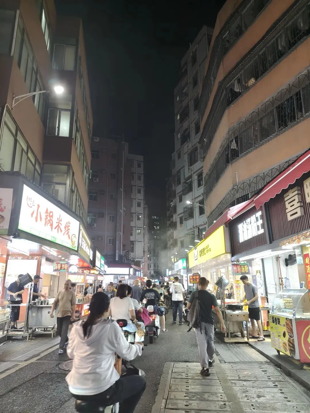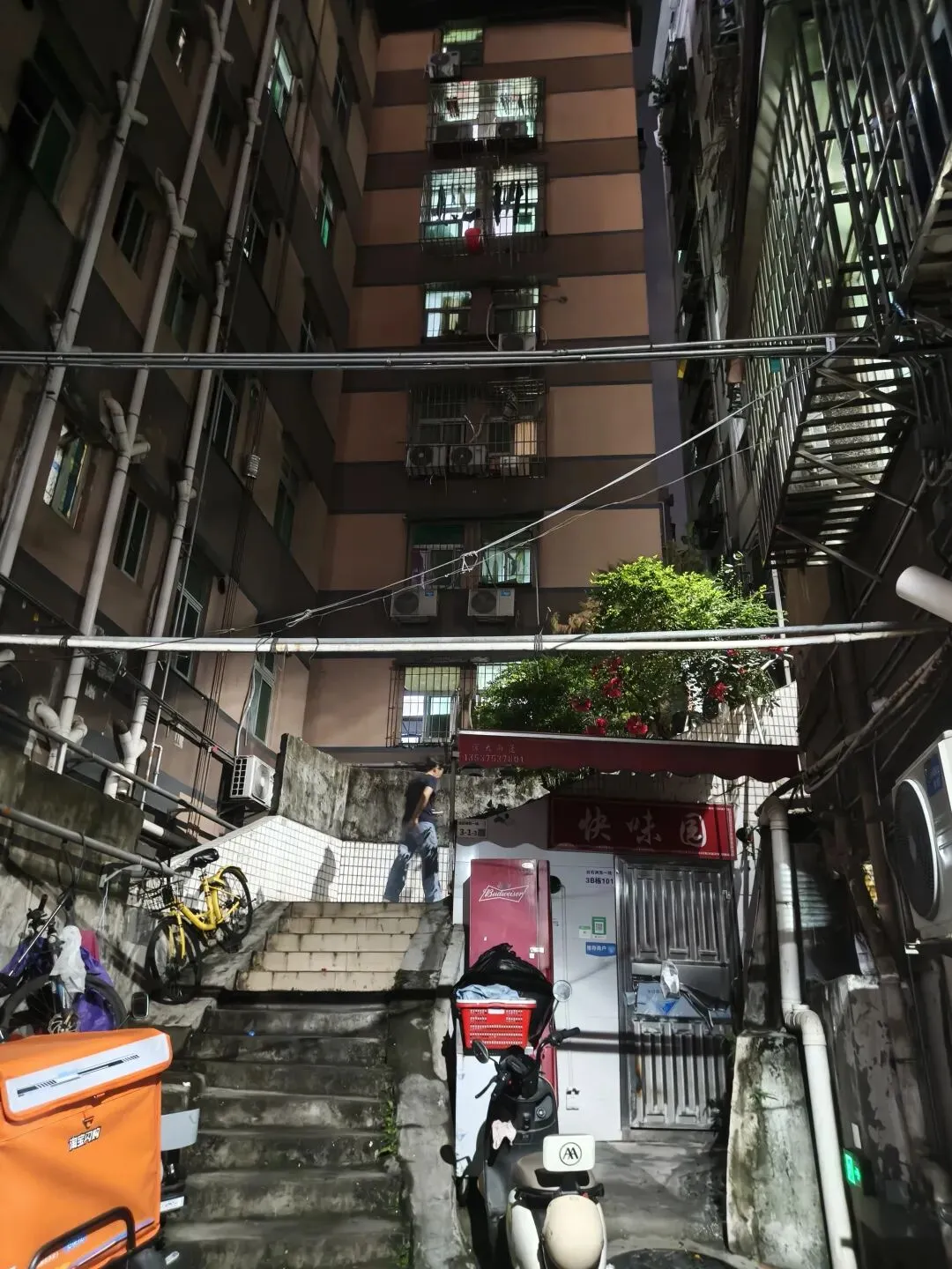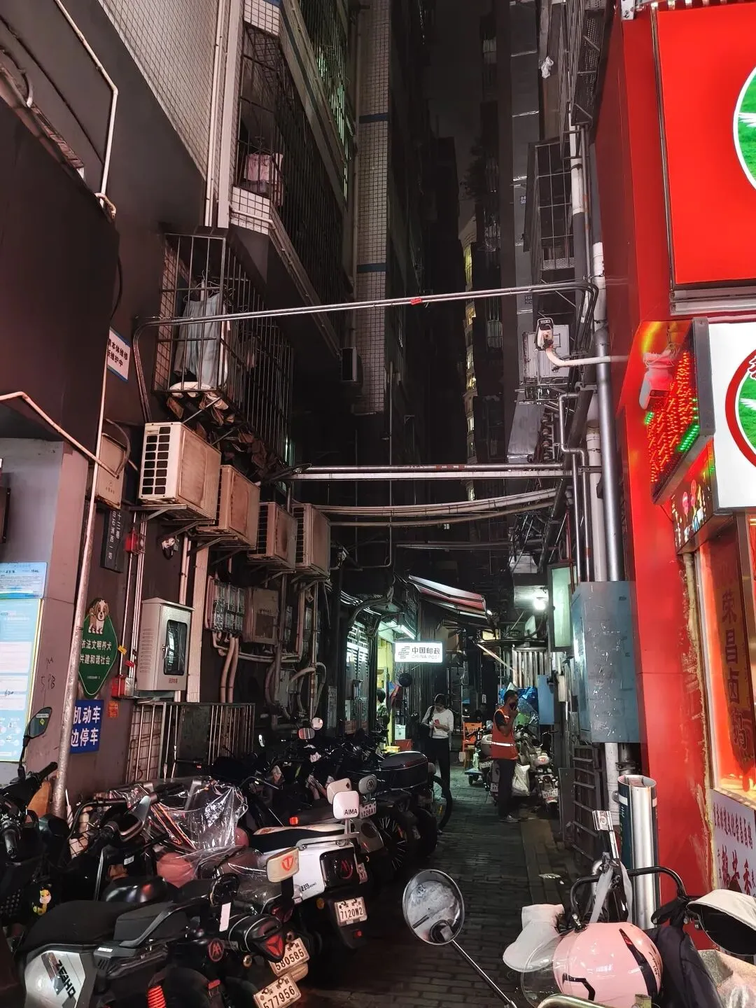 范老师不愧在职场厮杀历练了这么久,精力多到离谱,吃完猪肚鸡还不忘带我去饭店后面逛逛。就这样我第一次看到了念念已久的广式城中村。耳边突然想起熟悉的旋律,五条人实在太适合这个地方了。“你说,难得晴天,阳光很美,不如我们!来跳个舞wuwu~亲爱的广东姑娘lailailailai,亲爱的广东姑娘我爱你!”“风吹过石牌桥,我的忧伤该跟谁讲,天空挂着一轮红月亮,她来自梦幻丽莎发廊”....范老师说城中村的楼大多是个体户所建,为了多收租金,会把楼和楼之间建的很近,且这里面住的什么人都有不太安全。从车水马龙的街道钻进来,这里仿佛是另一个世界,完全看不出外面是深圳最繁华的地方。我们在电动车和楼道之间穿梭了很久,范老师看到路边有卖番石榴的,穿着西装钻进水果店挑了两个“看上去很甜的”。回家吃了才发现被坑的很彻底...