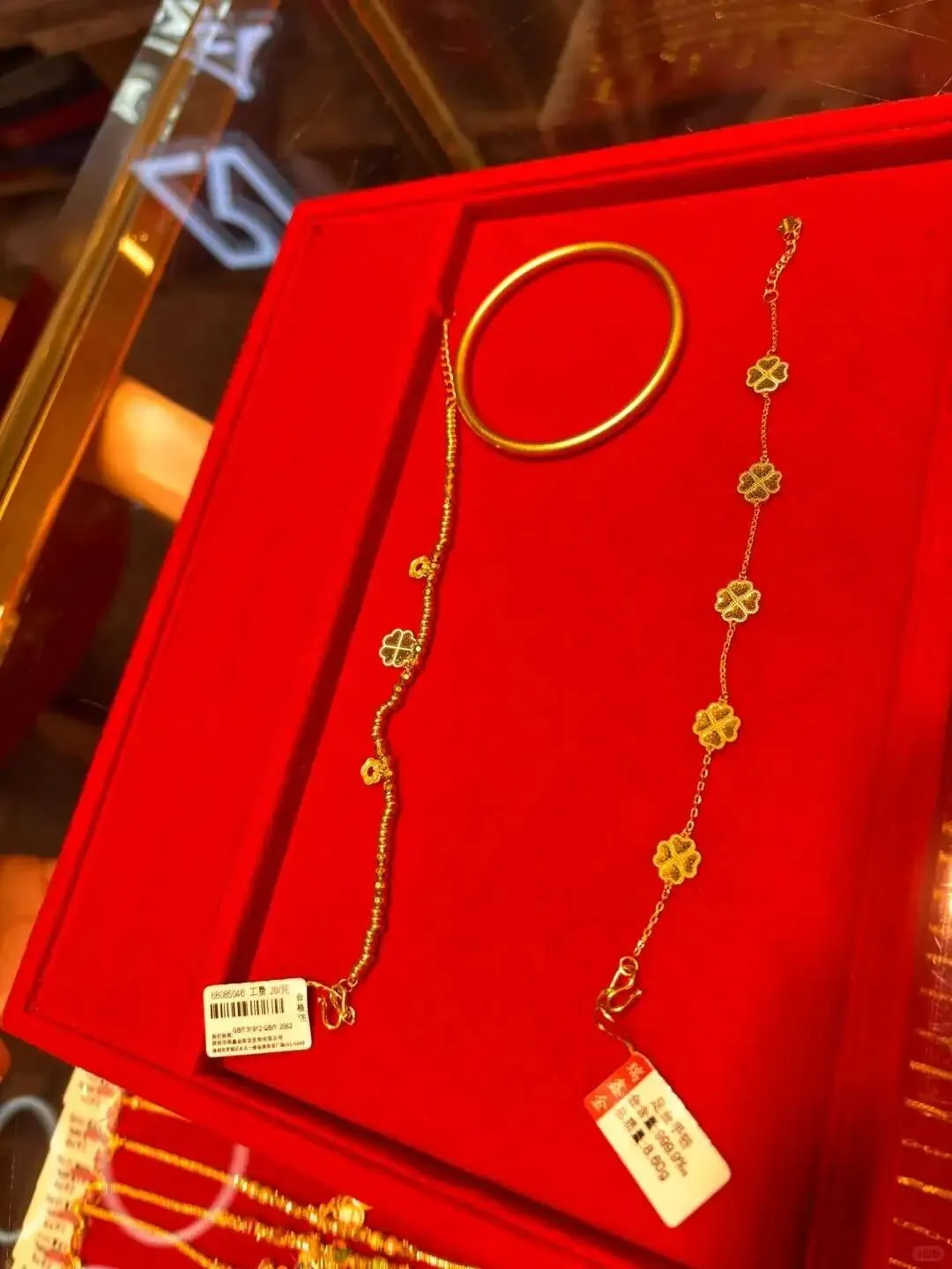 我自己一直把黄金当首饰优先、流转其次。日常佩戴的一只细圈手镯,是我特意选的小克重,通勤打字不硌手,夏天也不闷。闺蜜见面会摸一下说很轻盈,我妈会念叨“不如粗一点更踏实”,但我就是要能每天戴,镜头里也好搭配😄。后来又配了个小豆豆吊坠,白T配开衫就有点点亮,跑步时也不会甩得不舒服。