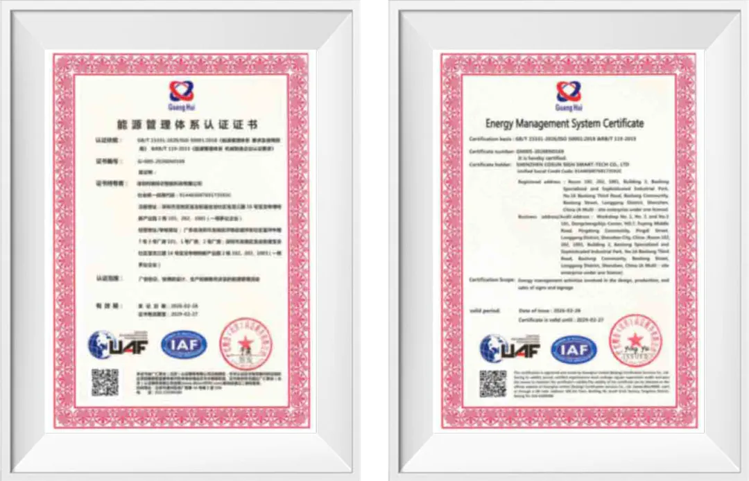 顺应绿色发展趋势,柯赛标识高度重视能源管理工作,建立并运行能源管理体系,从生产流程优化、设备节能升级,到能耗监测、数据分析与过程管控等多方面持续推进,逐步形成规范化、可持续的管理机制,并顺利取得能源管理体系认证。