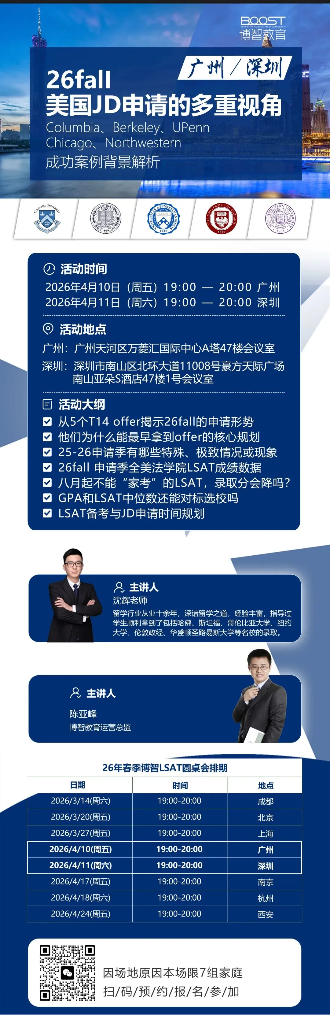 博智教育特别策划「LSAT 与 JD 申请圆桌会全国巡讲」,届时陈亚峰老师和沈辉老师会深度解析博智T14申请成功案例,为你拆解申请逻辑,规划备考路径,让你在 27fall 申请季中抢占先机。