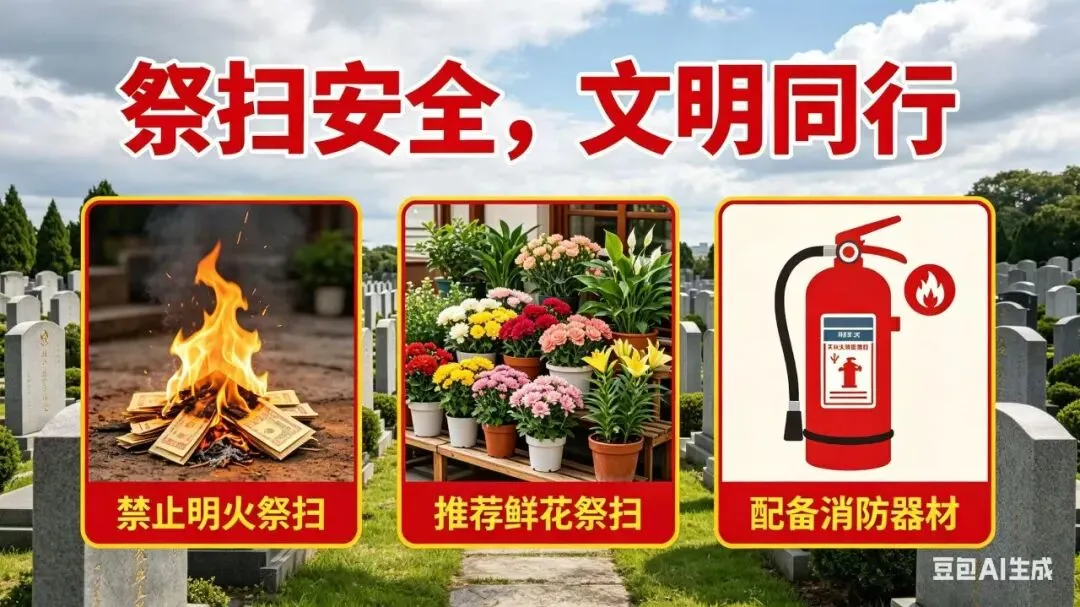 文明祭扫,摒弃明火,选择鲜花祭扫、网络缅怀等绿色方式;外出祭扫远离易燃区域,做好防火安全,遵守场所秩序。