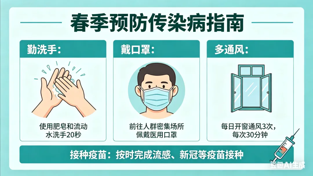 春季气温多变,注意增减衣物;规律作息,合理饮食,远离生冷不洁食物;做好过敏防护,减少蚊虫叮咬。