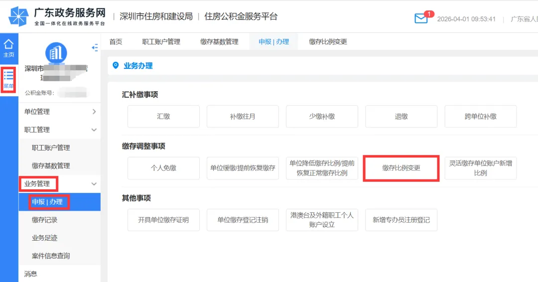 2026年4月1日起,单位专办员可通过刷脸、ODC证书、数字证书、电子印章等方式登录深圳公积金业务在线办理平台(https://gjj-zxbl.zjj.sz.gov.cn/ish#/login),线上填报申请信息并办结相关业务;若线上填报后有需要,也可预约前往深圳市住房公积金归集银行网点办理。