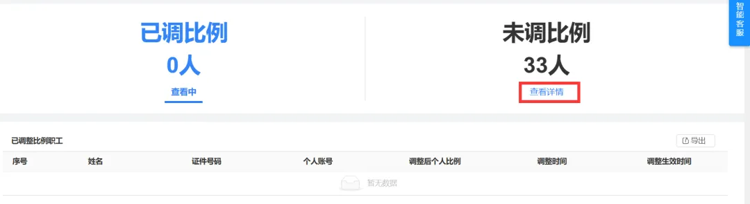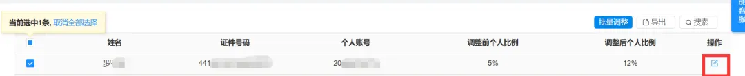 操作流程:单位缴存比例→点修改→单位缴存比例是否调整(否)→个人缴存比例是否调整(是)→未调整比例XX人(查看详情)→选择需要调整比例的员工前面打勾,比例可选5%-12%→提交即可。