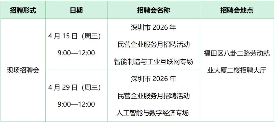 除了4月1日这场批发零售专场招聘会以外,4月深圳还有两场市级招聘会,分别是智能制造与工业互联网专场、人工智能雨数字经济专场,地点也是同一个地址:福田区八卦二路劳动就业大厦二楼,排期安排如下,具体招聘企业及岗位,还在陆续报名更新中,可以在我们公众号后台发送【市级招聘会】获取最新消息及查询入口哦!后续每周一我们也会汇总当周招聘会,里面会详细介绍,敬请期待!