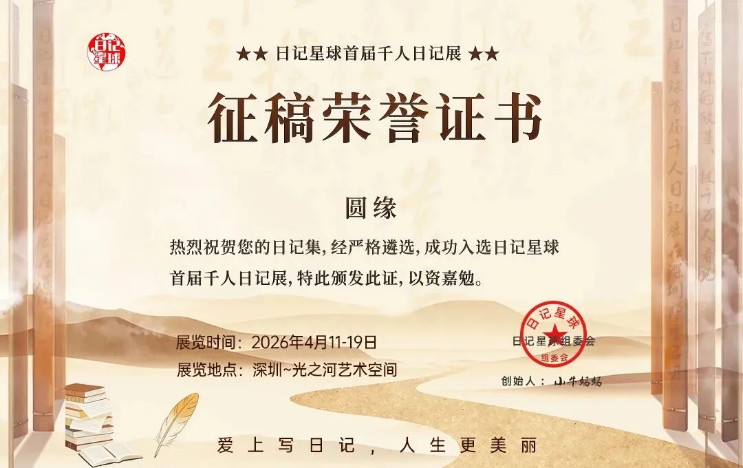 今天特别开心,我的日记成功入选4月11日—19日深圳星球千人日记展,还拿到了奖状,这份认可让我满心欢喜。