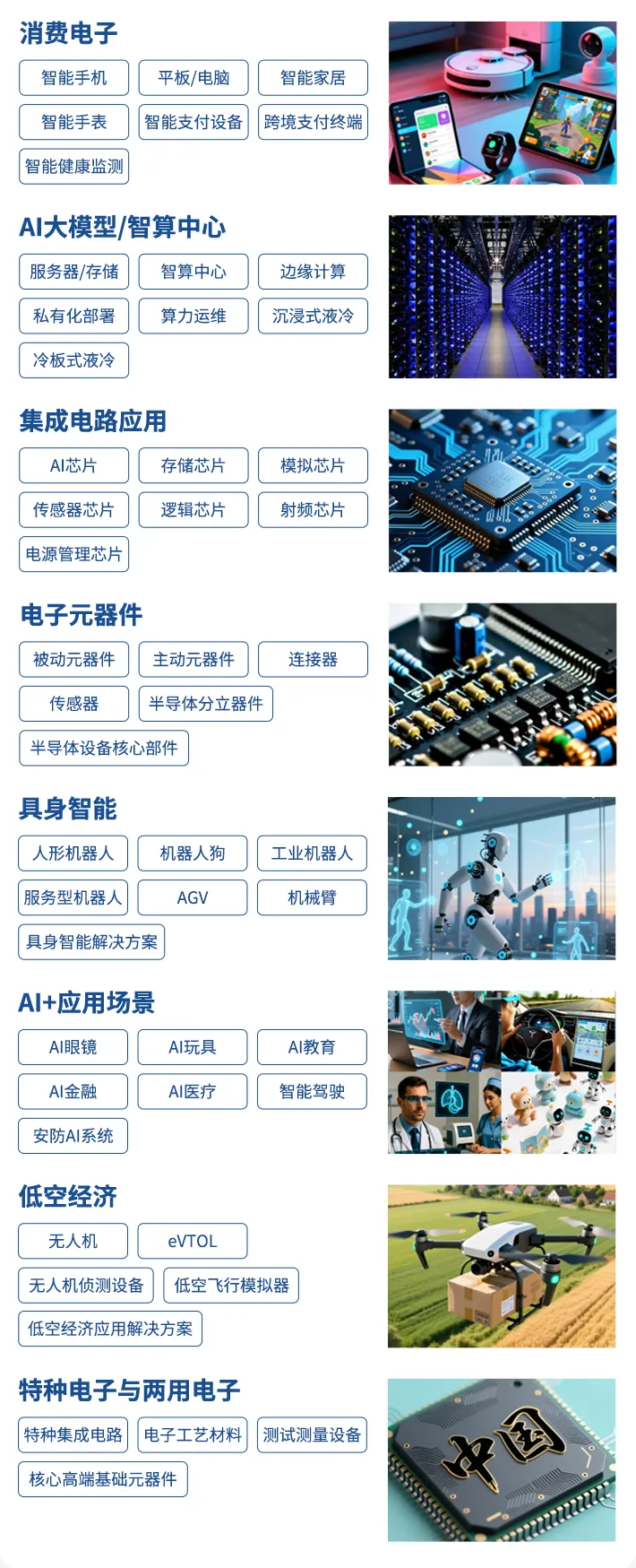 A: 聚焦电子信息全产业链,覆盖消费电子、AI + 应用场景、具身智能、AI 大模型 / 智算中心、低空经济、集成电路、电子元器件、特种电子与两用电子等前沿领域,汇聚超 1000 家行业领军企业展品。