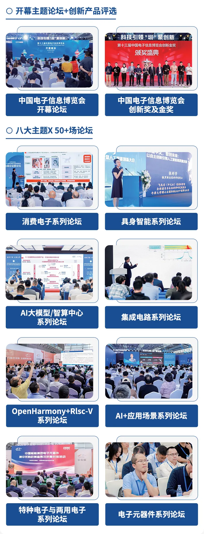 A: 举办开幕主题论坛 + 创新产品评选,八大主题 50 + 场专业论坛,覆盖消费电子、具身智能、AI 算力、集成电路、电子元器件等领域,同步开展供需对接活动。