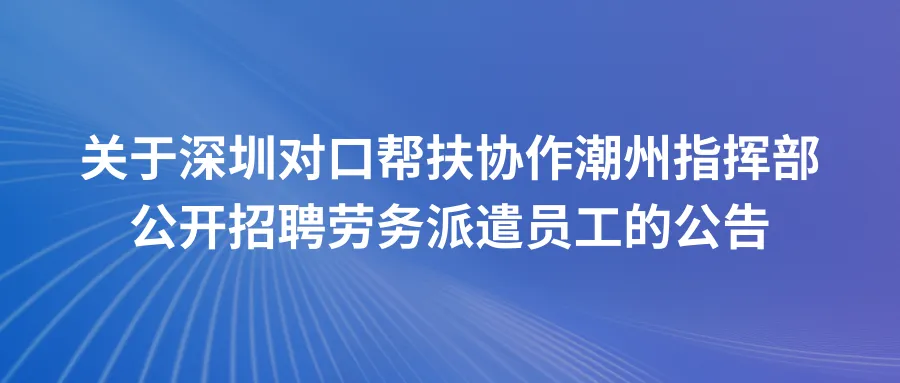 根据深圳对口帮扶协作潮州指挥部关于劳务派遣员工招聘需求,潮州市城市人力资本有限公司受客户单位的委托,按照公平、公正、公开原则面向社会公开招聘相关岗位工作人员。