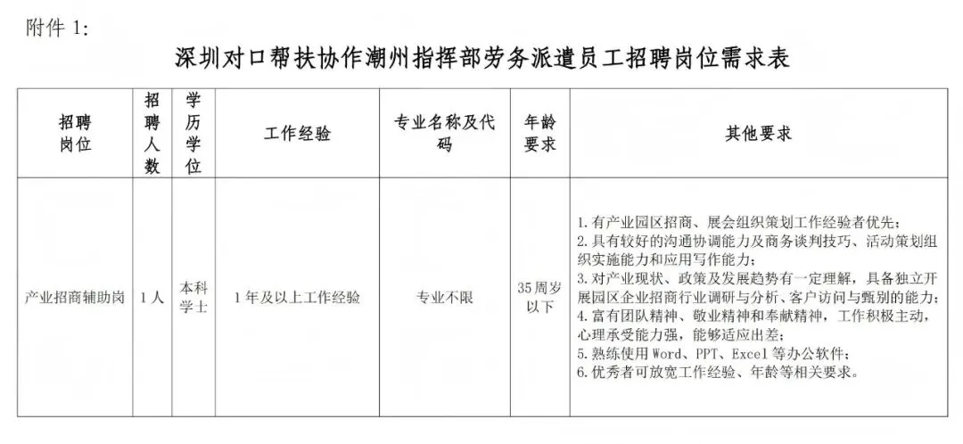详见附件1《深圳对口帮扶协作潮州指挥部劳务派遣员工招聘岗位需求表》