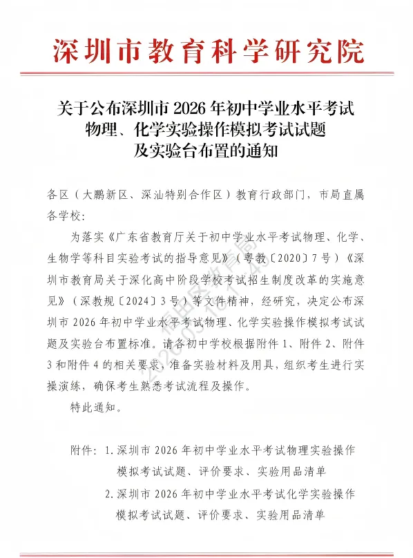 今年的实验操作考试时间:5月23日至24日。深圳市教育科学研究院已发布2026年初三物理、化学实验操作模拟考试试题,一起来看看具体内容。