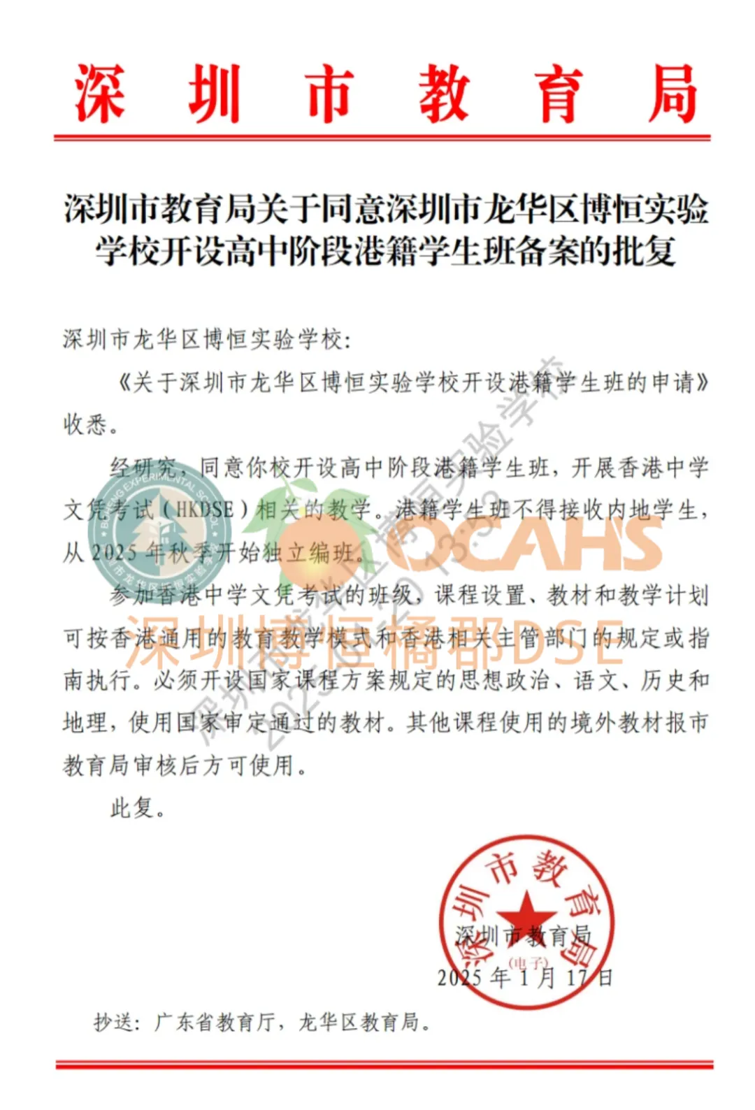 深圳博恆橘郡DSE成立于2017年,經深圳市教育局正式備案,納入深圳市中考港澳課程自主招生範圍(中招代碼:8311024),是大灣區國際教育聯合會首批成員學校。作爲首批落地深圳辦學的專業香港DSE課程教學團隊,發展至今已經培養了8屆畢業生,累計畢業生超過千餘名。自成立以來,我校畢業生40.7%被港前三大學錄取,51.9%被港前五大學錄取,香港八大及國內985/211大學錄取率達到96%,畢業生名校錄取率以及畢業生數量居全國前列。