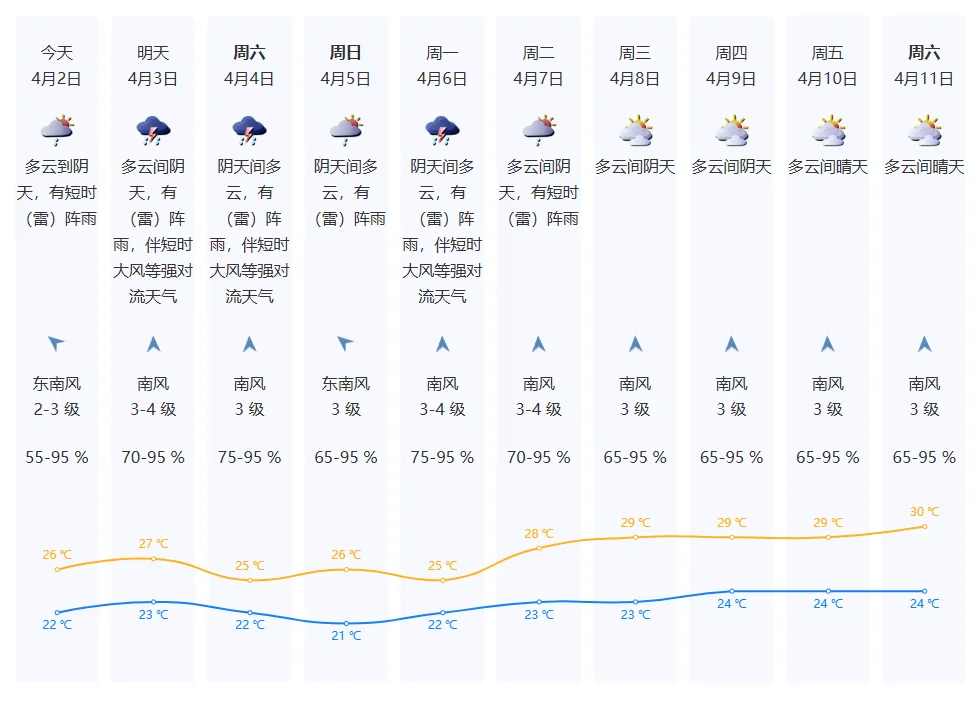 4月2日,多云到阴天,有短时(雷)阵雨。