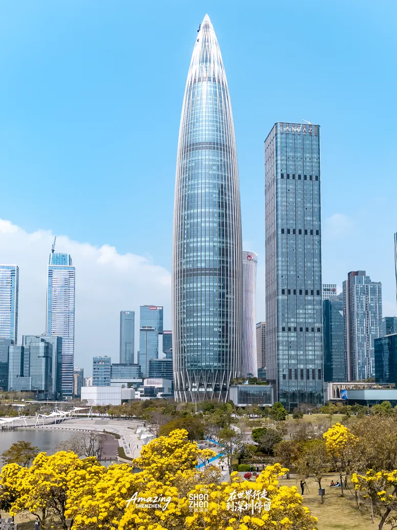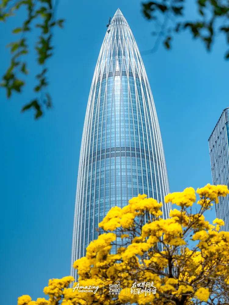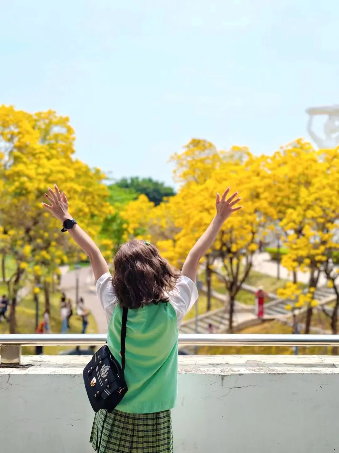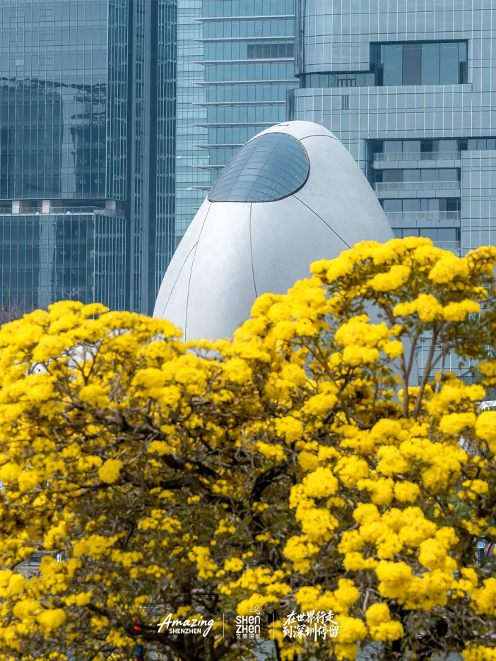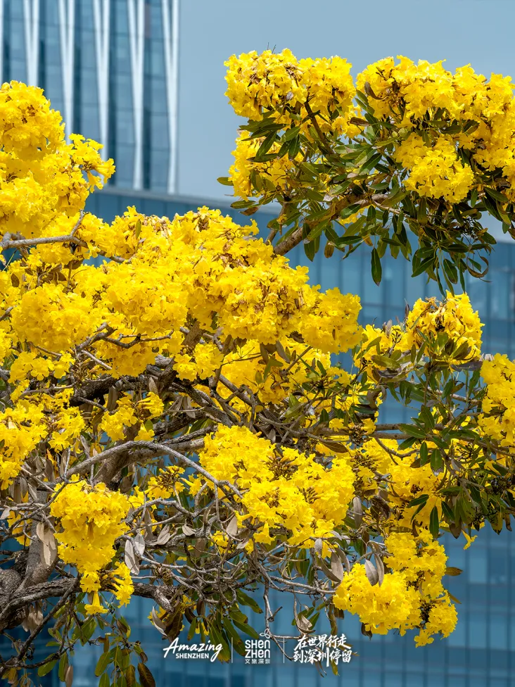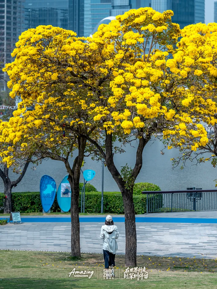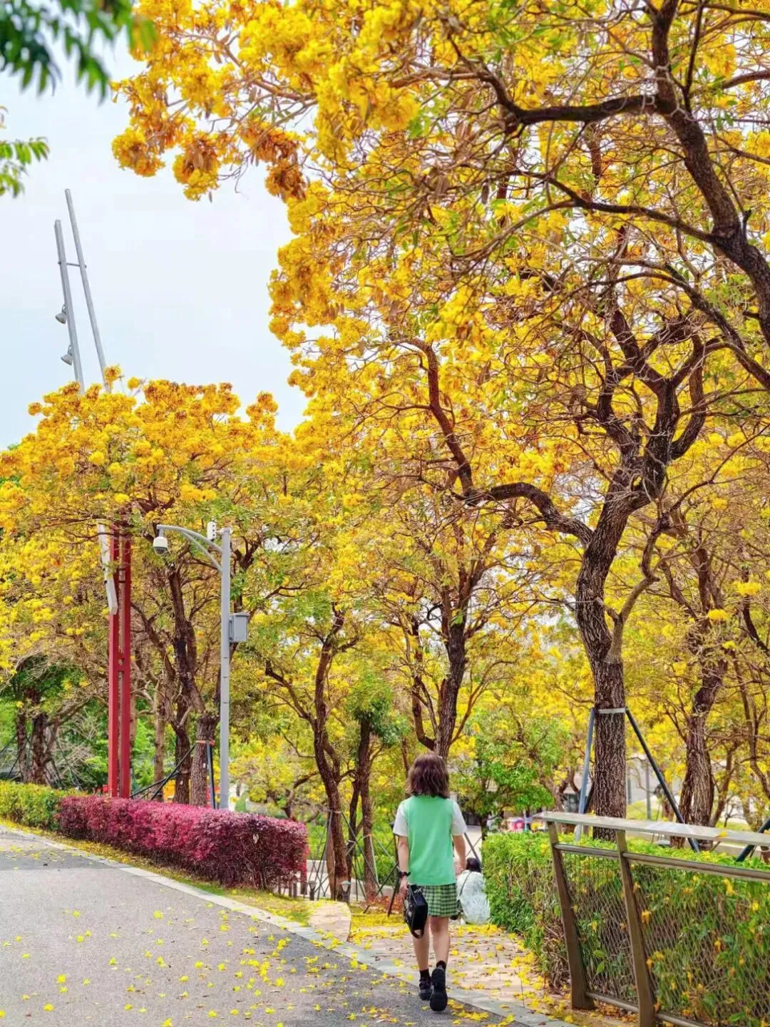 “春笋”是这里的“绝对C位”,成排的银鳞风铃木开得正旺。在这里拍照,金黄色的花海与远处的“春笋”大厦、蓝天白云同框,现代都市与自然风光完美融合,怎么拍都好看。