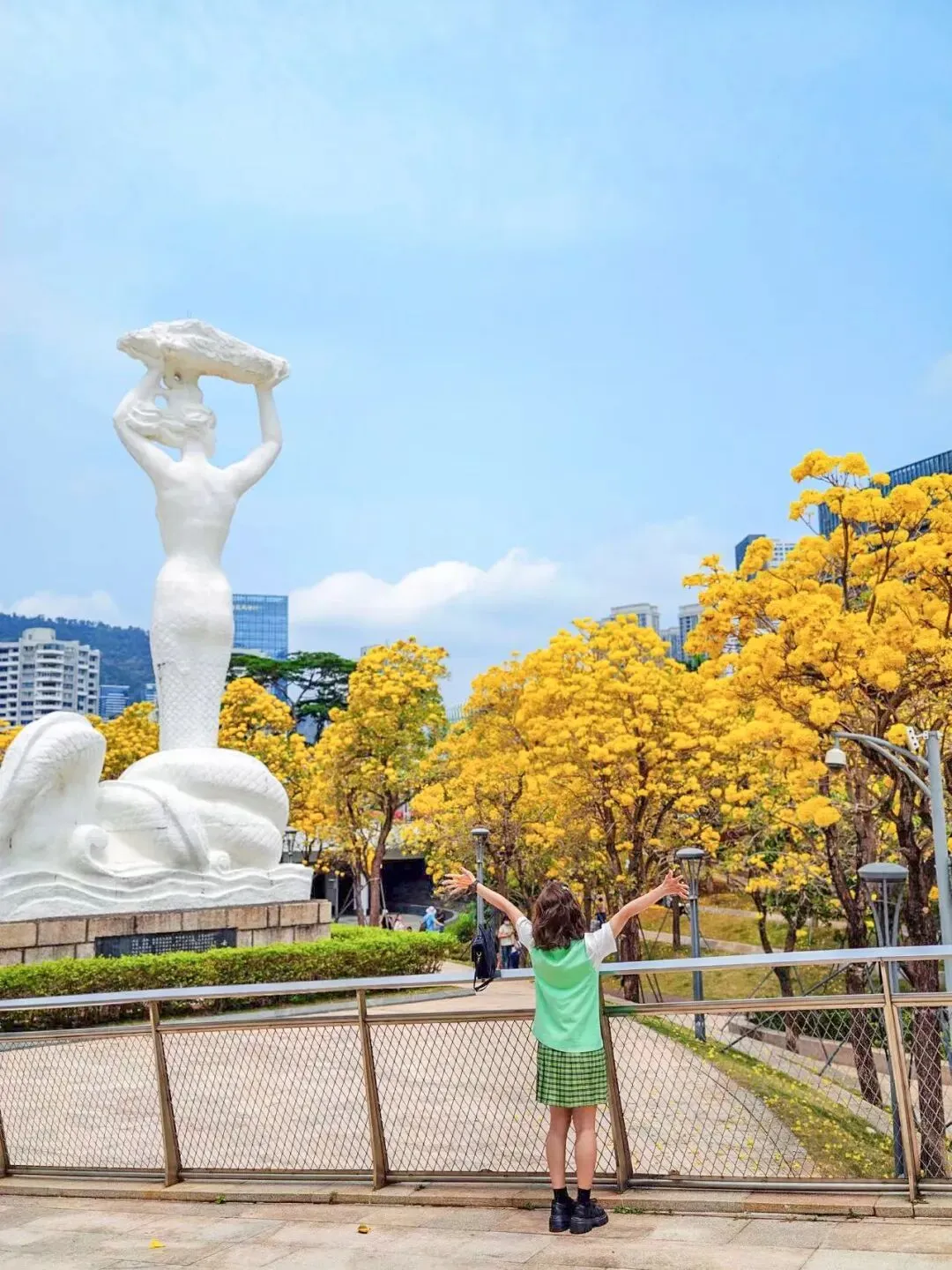 位于蛇口的女娲滨海公园,这里的银鳞风铃木围绕着女娲补天石像盛放,仰头便是漫天金黄,与碧海蓝天相映成画。