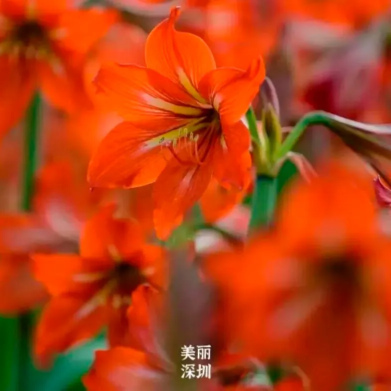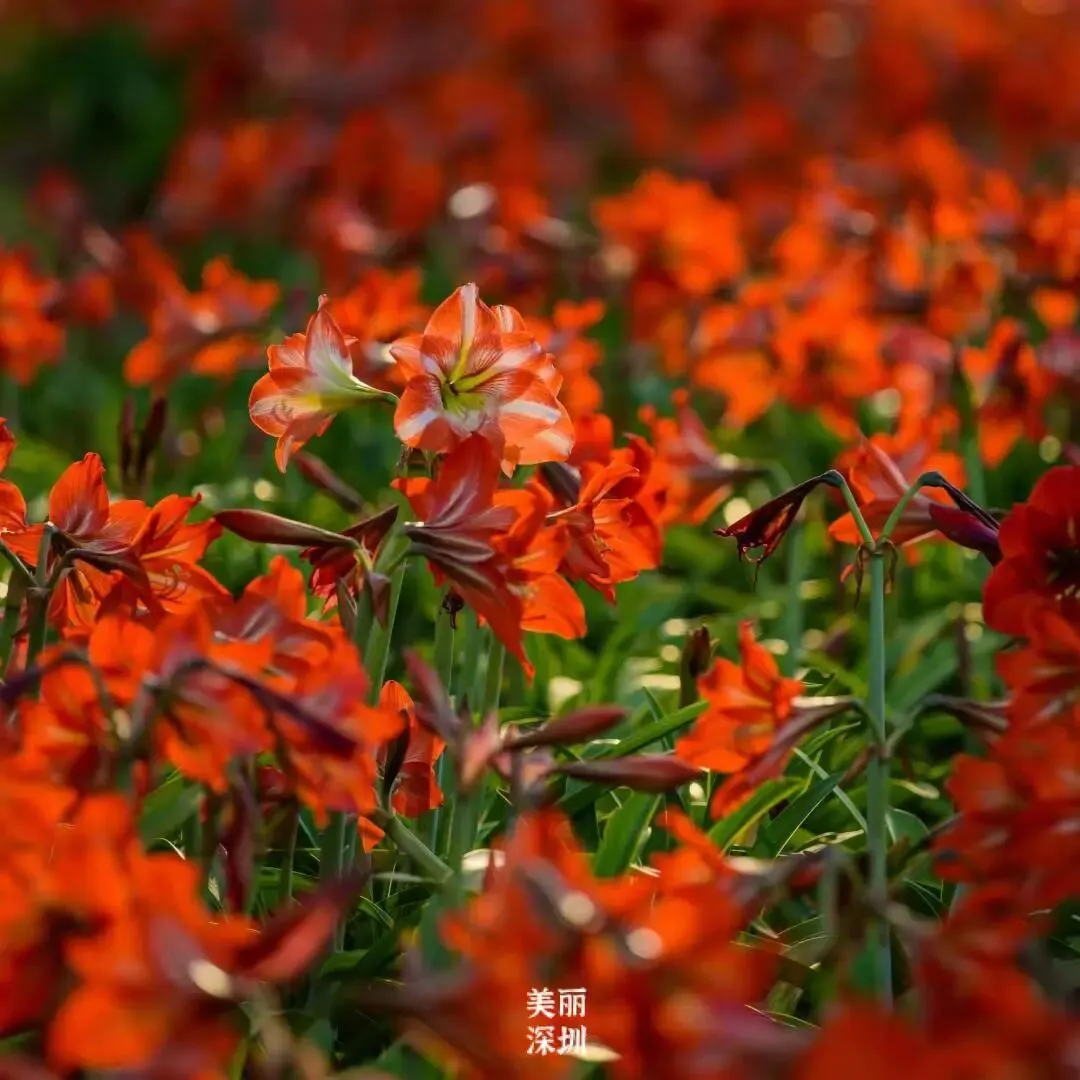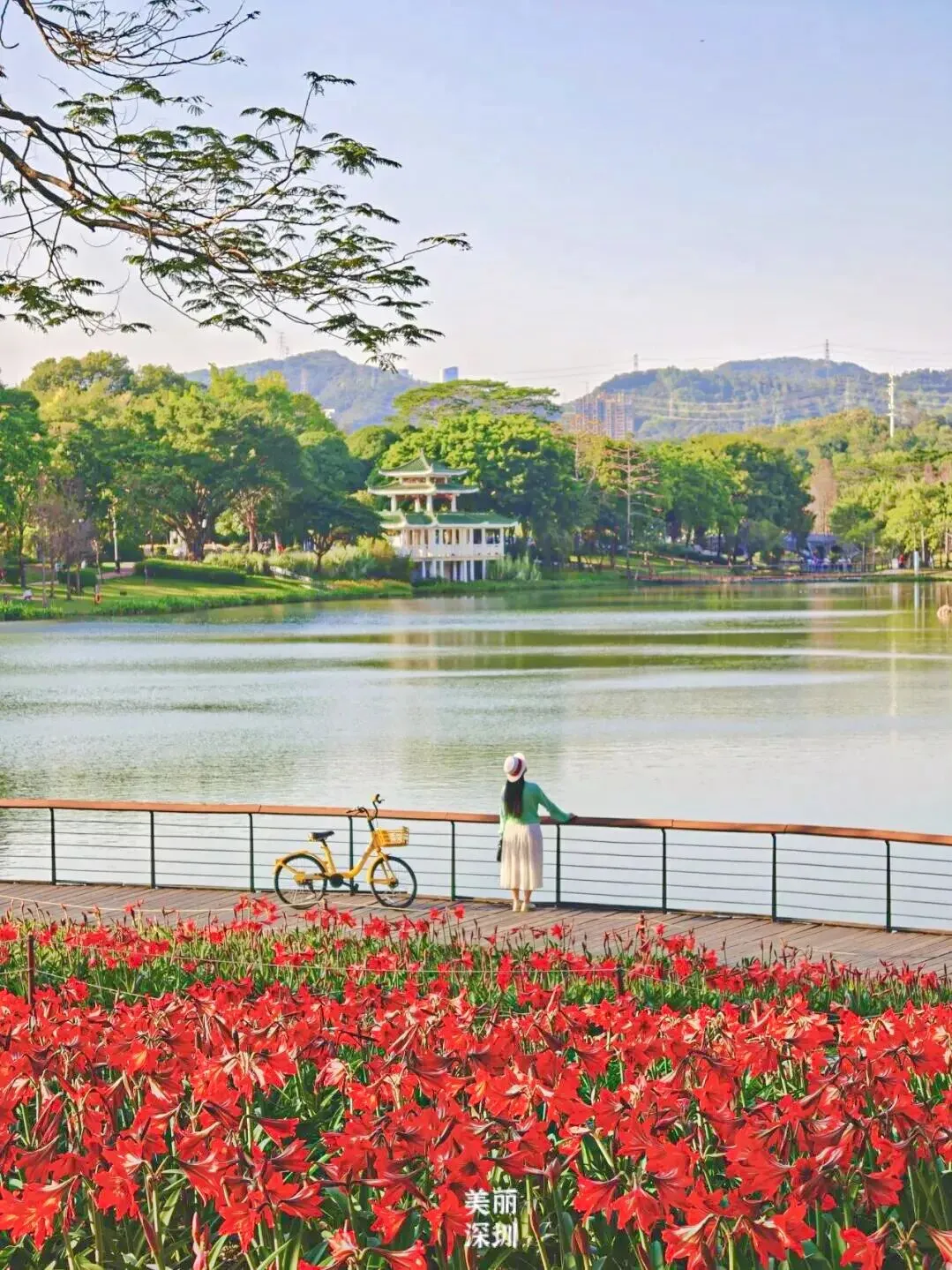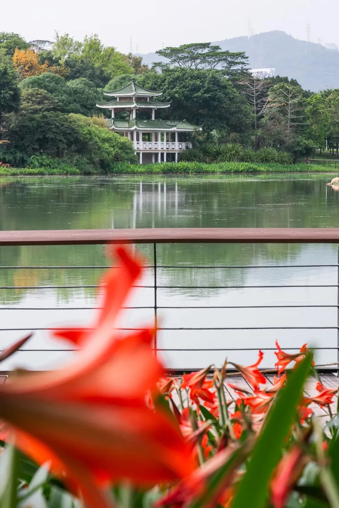 热烈如火的朱顶红沿着观景湖畔绽放,围起半圈绚烂的花海,花丛中有几条蜿蜒的小径通往湖边,漫步其中,仿佛被花团温柔簇拥,别有一番韵味。