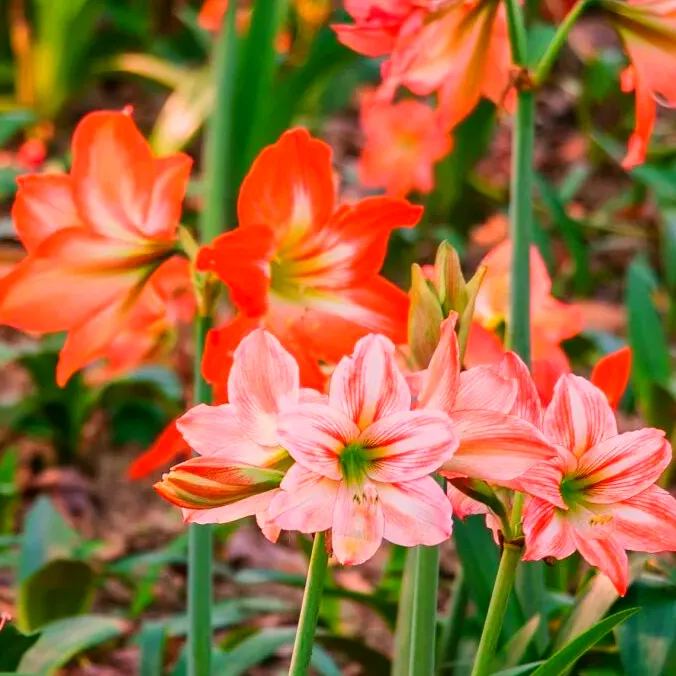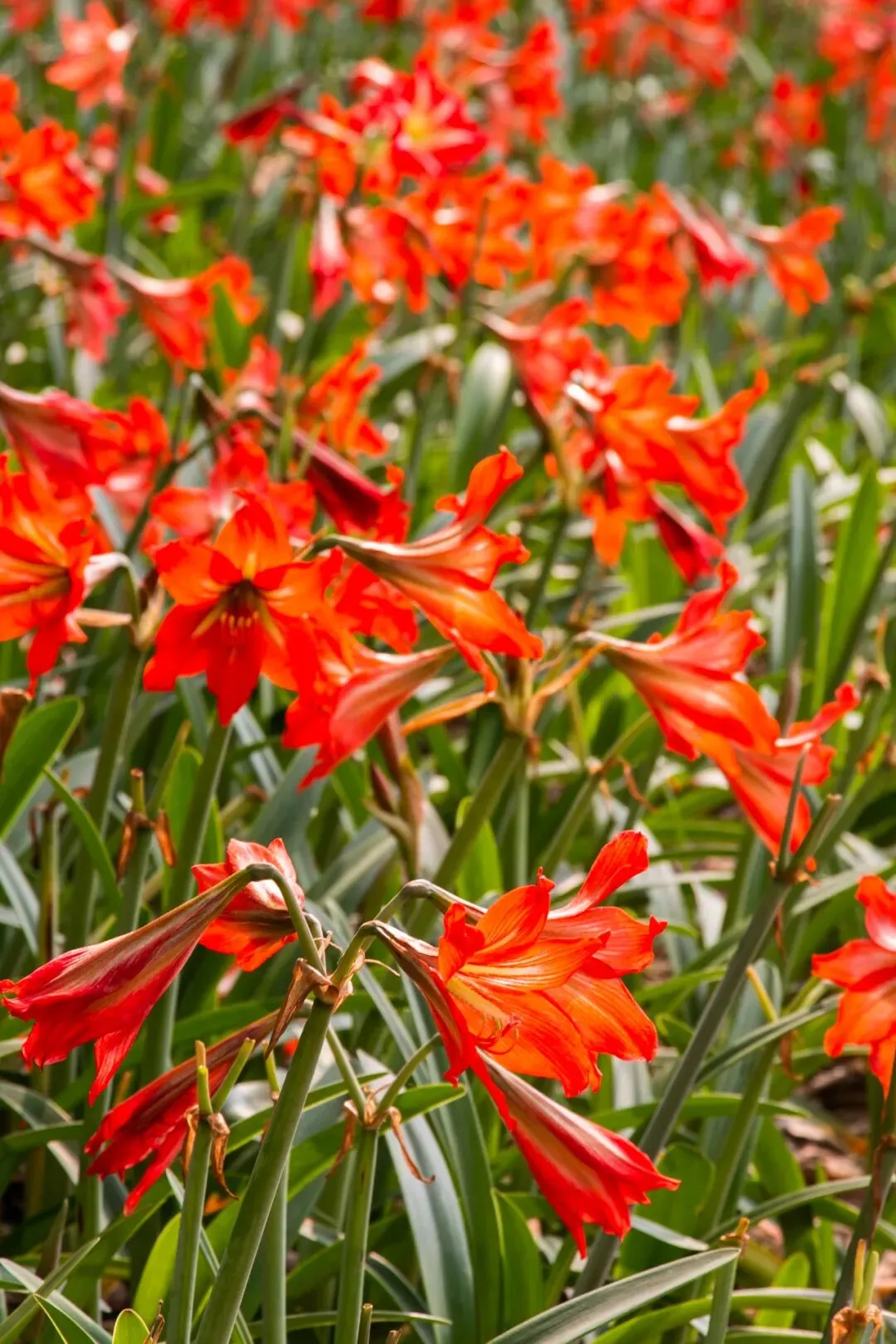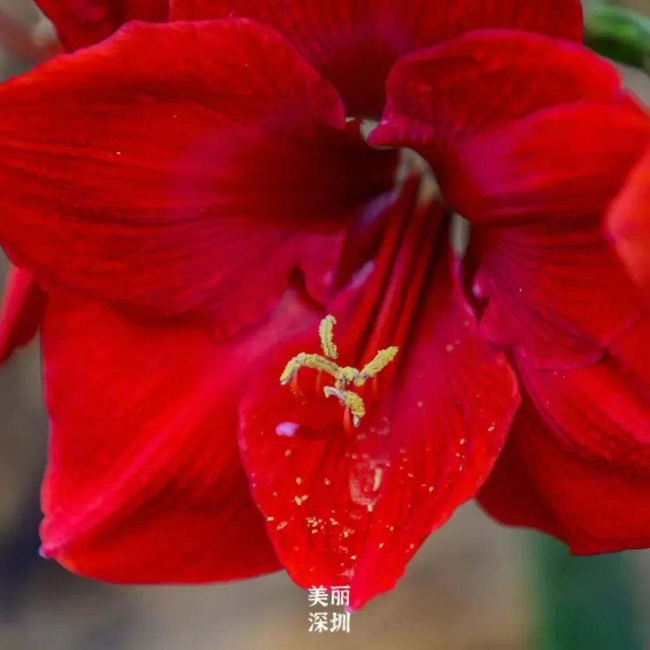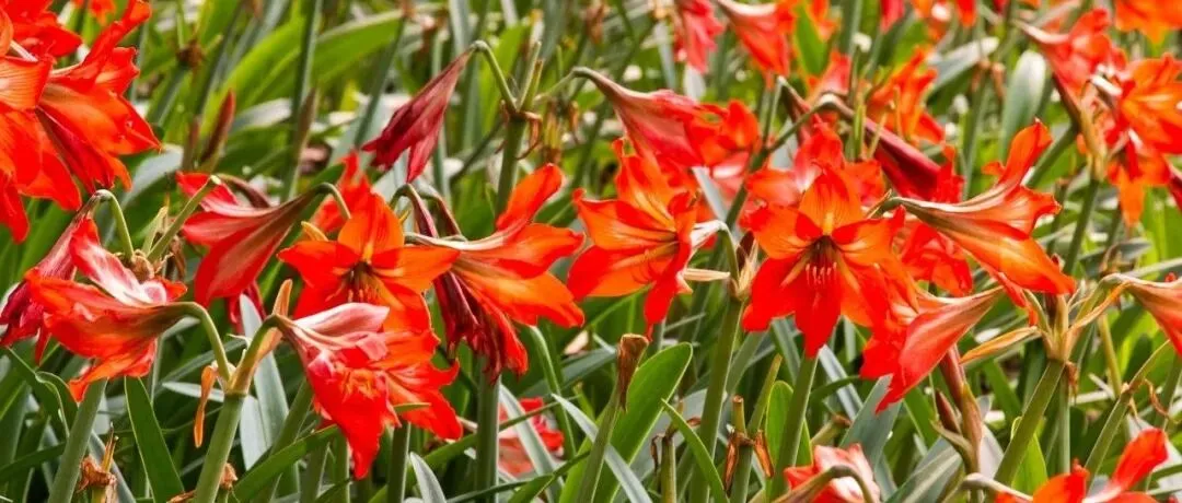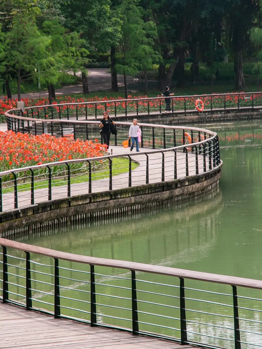 热烈如火的朱顶红沿着观景湖畔绽放,围起半圈绚烂的花海,花丛中有几条蜿蜒的小径通往湖边,漫步其中,仿佛被花团温柔簇拥,别有一番韵味。