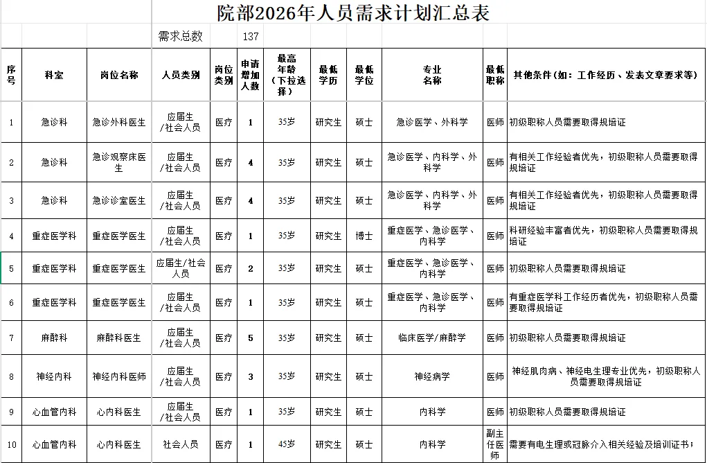 因医院发展需要,我院部分科室需招聘人员,现公开2026年院部人员需求招聘计划,具体要求如下: