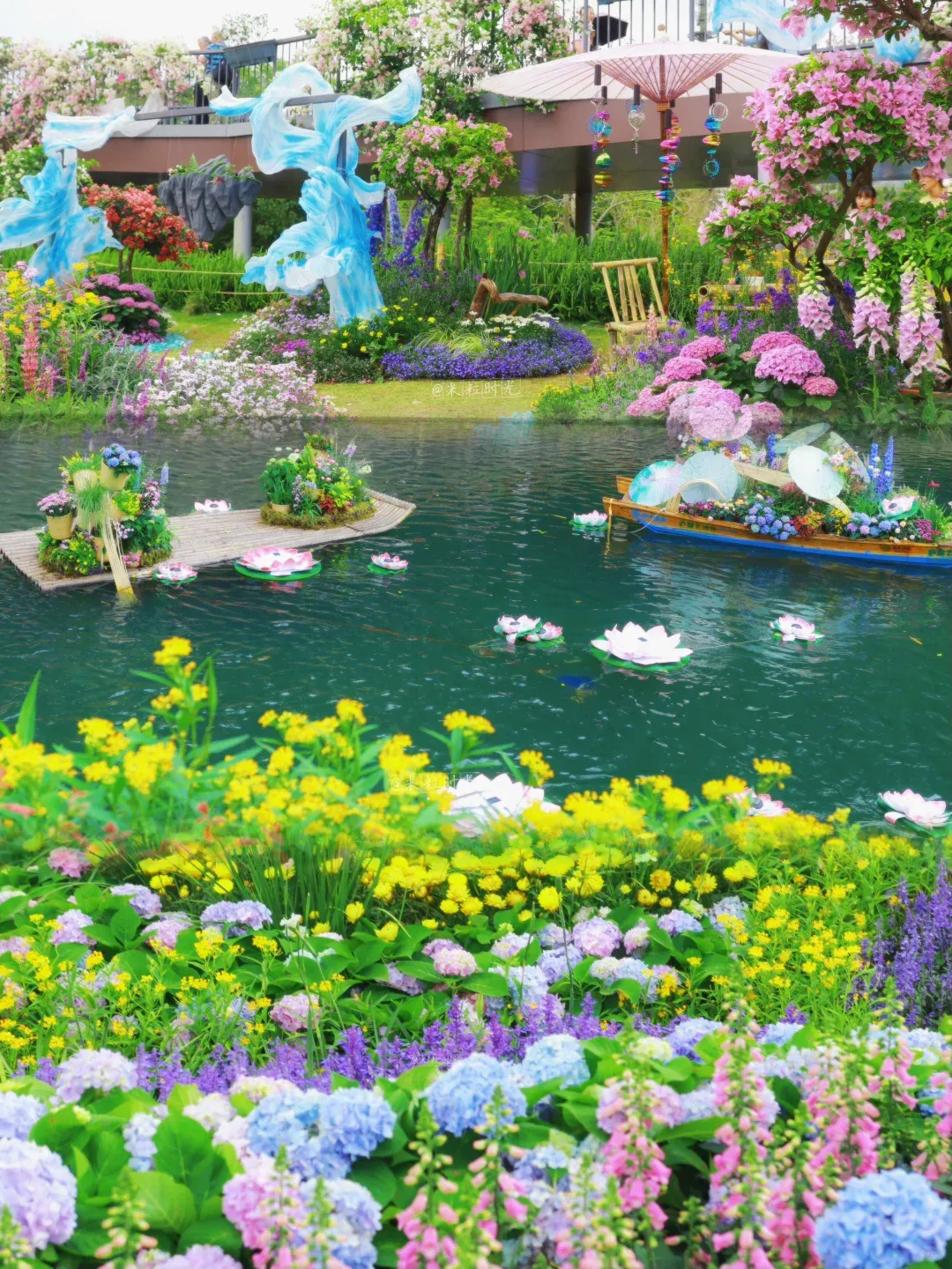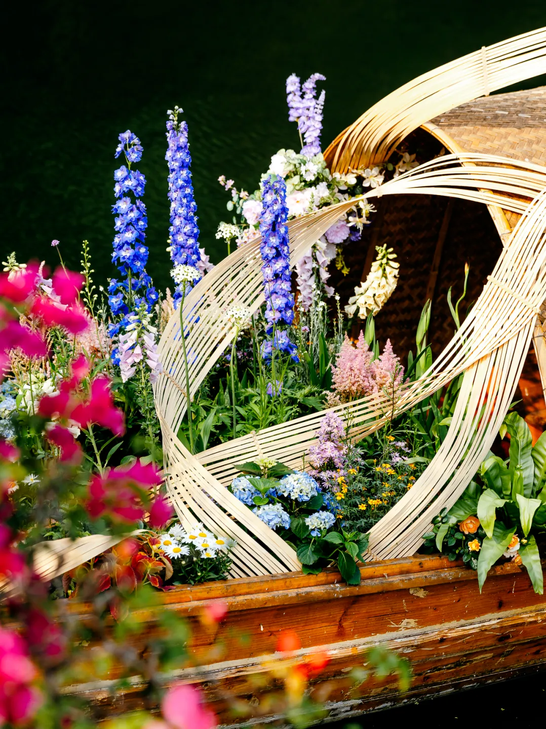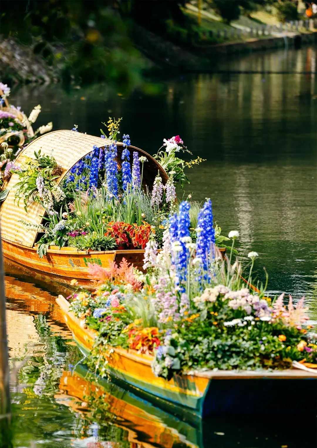 木舟被鲜花填满,绣球、高翠雀花、毛地黄竞相绽放。缤纷花色在水面晕开,宛如走进莫奈笔下的油画世界。