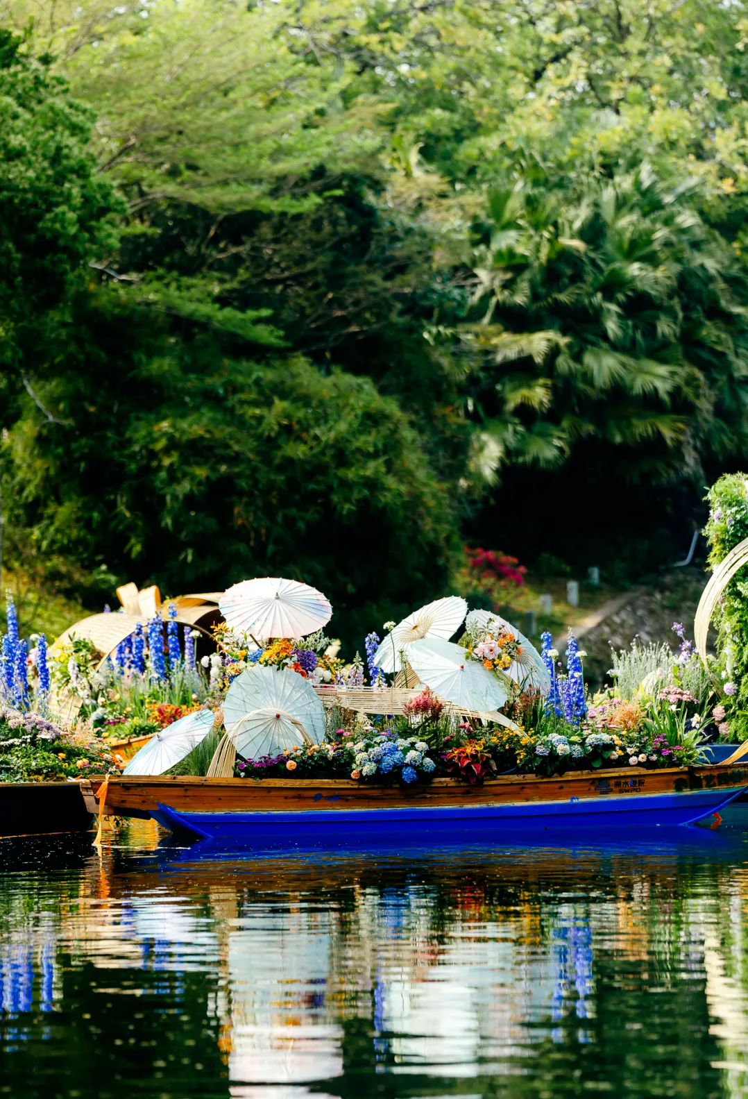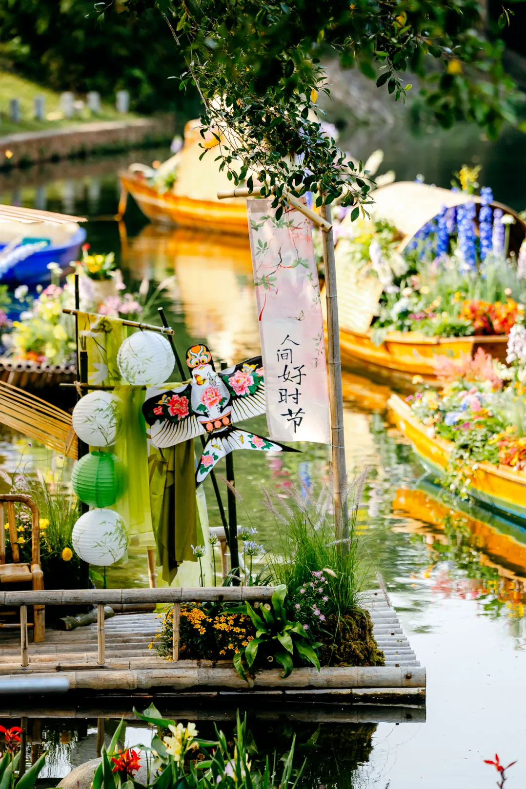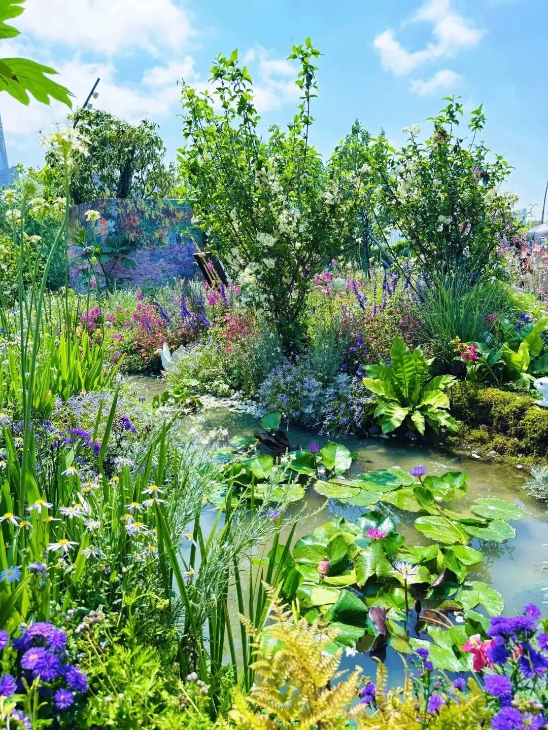 木舟被鲜花填满,绣球、高翠雀花、毛地黄竞相绽放。缤纷花色在水面晕开,宛如走进莫奈笔下的油画世界。