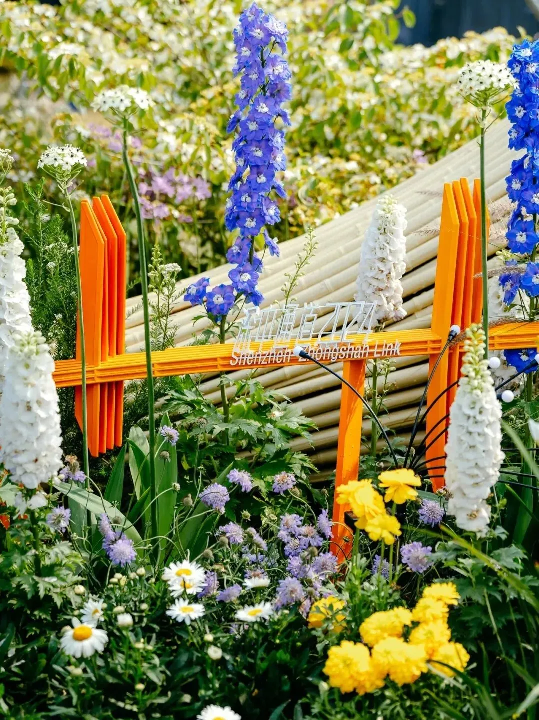 巨型花朵装置坐落其中,橙色装置如绸带般蜿蜒穿梭在花丛间,标志着深中通道、湾区之眼等湾区的标志性建筑。