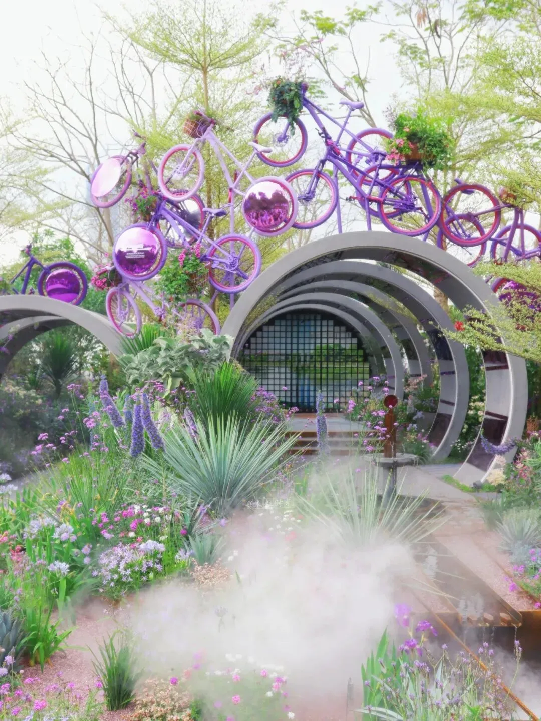 以“自行车”为主题,以各色三角梅、白芒草、飞燕草搭配。一辆辆紫色自行车停靠在花径中、花架旁,像是骑着车穿梭花海间,随意停靠下车赏花,打造了一处轻松自在的场景。