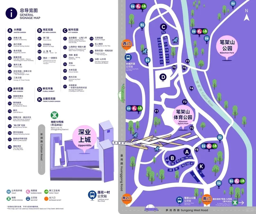 深业上城连廊/南门入园 → 主题花花园(三角梅超美)→ 大师园(看国际花园、摸 AI 装置)→ 湾区花园(认各地地标)→ 城市花园(找对应城区花园)