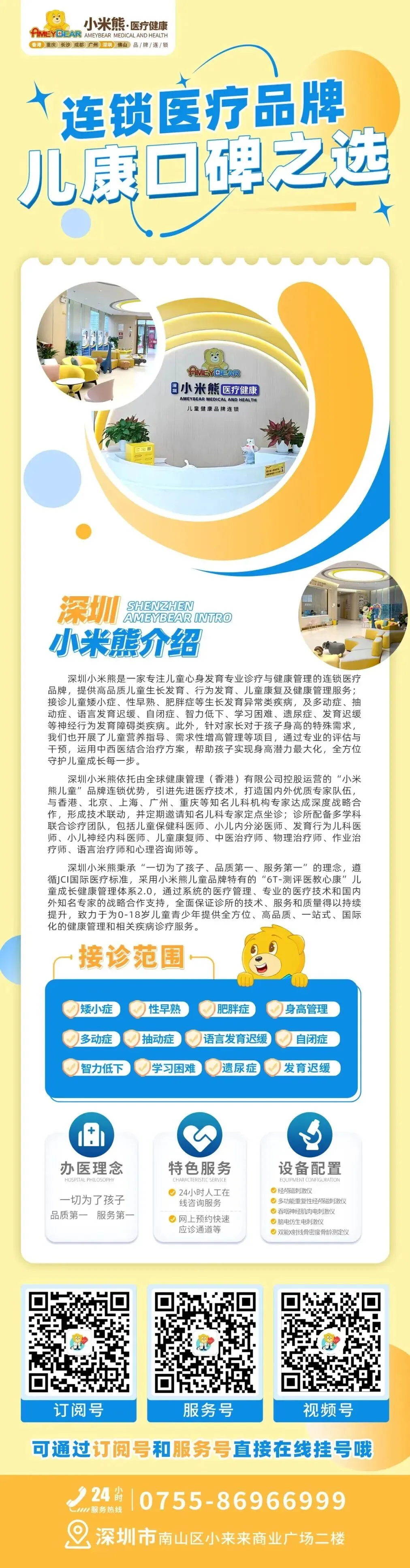 • 诊疗范围:涵盖矮小症、性早熟、肥胖症、身高管理、多动症、抽动症、语言发育迟缓、自闭症、学习困难、智力低下、发育迟缓等各类儿童发育问题,针对性提供专业诊疗与干预方案。