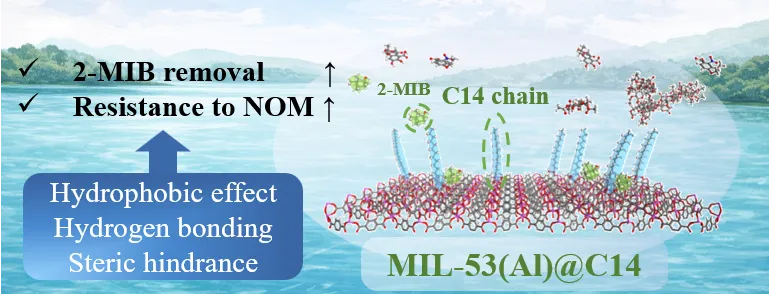近日,深圳职业技术大学材料与环境工程学院高静思团队在环境领域顶级期刊 Water Research上发表了题为“Selective Removal of Trace 2-Methylisoborneol in Real Waters via Hydrophobic Interface-Driven Adsorption”的研究论文。该研究通过疏水界面工程策略,制备了一种金属有机框架(MOF)吸附剂MIL-53(Al)@C14,实现了对饮用水中痕量异味物质2-甲基异莰醇(2-MIB)的快速、选择性去除,为应对复杂水体中微量有机污染物的深度净化提供了新思路。