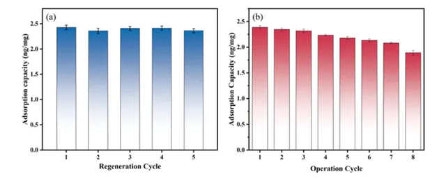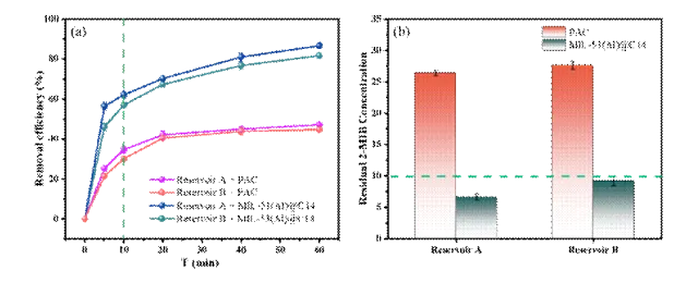 材料在五次再生循环后吸附容量仅损失2.9%,且在不再生条件下连续处理八批次后仍保留约80%的初始容量,展现出良好的可重复使用性和运行稳定性。初步成本分析显示,在“使用三次-再生一次”循环五次的生命周期下,MIL-53(Al)@C14处理每吨水的成本约为1.54元(0.223美元),较PAC的单次使用成本(1.11元,0.16美元)虽略有增加,但考虑其优异的出水水质和循环性能,具备良好的应用潜力。此外,该材料对土臭素、β-环柠檬醛等多种异味物质均表现出广谱去除能力,为复杂异味污染治理提供了新选择。