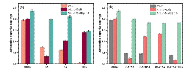 传统吸附材料如粉末活性炭(PAC)在处理痕量异味物质2-甲基异莰醇(2-MIB)时,具有操作简便、适应性广等优点,能通过物理吸附去除水中部分污染物。然而,PAC存在吸附速率慢、易受天然有机物(NOM)干扰、频繁更换导致运行成本高等问题,在复杂水体中的深度净化效率受到显著限制。金属有机框架(MOF)作为一种比表面积高、孔道结构规整、表面化学性质可调的新型多孔材料,在吸附分离领域展现出广阔应用前景。在疏水界面调控方面,MOF不仅可以作为吸附位点提供者,还可以通过表面接枝疏水链构建选择性微域。长链烷基膦酸修饰则是实现MOF疏水改性的常用策略,具有反应条件温和、接枝密度可控等优点。但是,单纯依赖MOF的孔道结构往往难以在复杂水体中实现对痕量目标物的选择性捕获,如何同时提高吸附剂对目标分子的亲和力和抗干扰能力是痕量污染物深度净化的关键问题。另外,对于2-MIB这类中性疏水分子,其与NOM的竞争吸附机制尚不明确,现有研究中往往忽略了对竞争机制的深入解析。因此,本研究以实际水体中痕量2-MIB的高效去除为出发点,构筑了疏水修饰的MIL-53(Al)@C14复合吸附剂,通过疏水界面工程构建选择性吸附微域。结合吸附动力学实验、竞争吸附实验和分子动力学模拟等手段,揭示材料对2-MIB的选择性吸附机制、NOM的干扰机制及传质过程,并将该材料用于实际水库水中2-MIB的深度去除,探究其消减规律及再生性能。