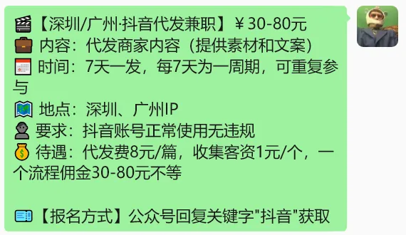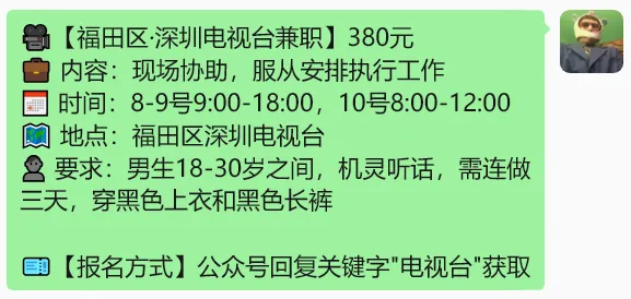【兼职合集】深圳电视台¥380元、发放游玩入场券¥230元、抖音代发¥80元、中考体育¥200元......