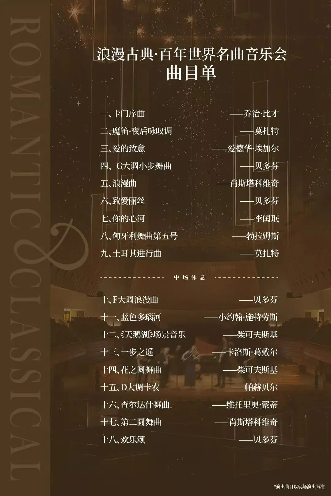 跨越世纪的浪漫与古典——百年世界名曲音乐会精心挑选了从古典到浪漫时期的大师杰作,演奏的曲目不仅贯穿了历史的长河,也展现了深刻的时代特色和音乐价值。这场音乐会是每位音乐爱好者不容错过的听觉盛宴。