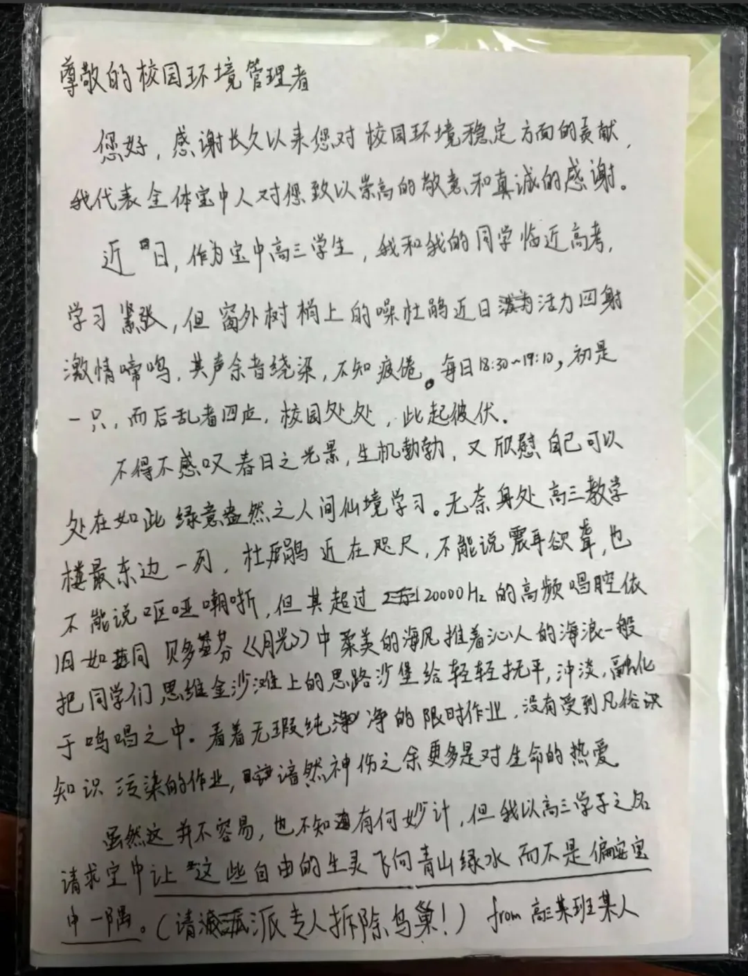 春日的早晨,校园里一切如常。阳光洒在操场上,树叶轻轻摇曳。然而,在宝安中学高中部的教室里,一名高三学生正在备战高考,他的眉头紧锁,笔尖停在练习册上。突然,窗外响起了鸟鸣——清脆、明亮,似乎在宣告春天的到来,也似乎在嘲笑每一个被时间“压迫”的灵魂。或许,在他他盯着窗外时,心里忽然冒出的念头是:“如果没有这只鸟,我会不会更专注一点?”说明:近日,深圳宝安中学(集团)高中部一名高三学生因备考期间,受校园鸟鸣干扰,写信请求学校“拆除鸟巢”。以下是学生的手写信的内容:尊敬的校园环境管理者:
