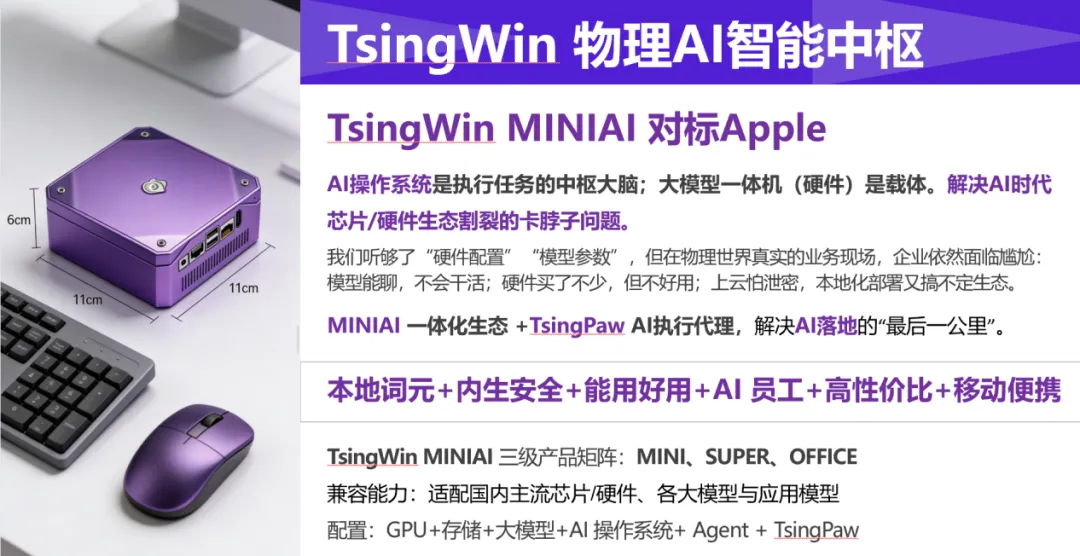 行胜数字TsingWin 是物理AI智能中枢创新引领者,打造了一套中国首创、自主可控的物理AI智能中枢产品——TsingWin MINIAI,为OPC与企业级用户解决AI落地痛点。