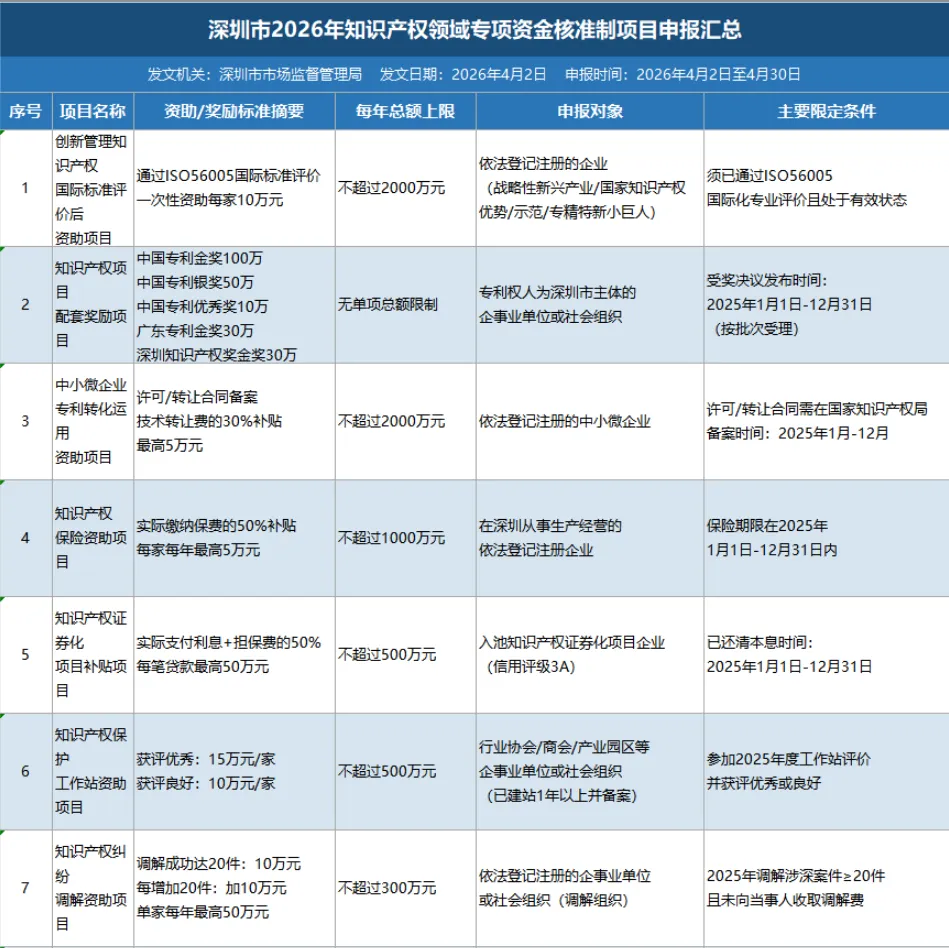 为做好知识产权领域专项资金核准制项目申报工作,充分发挥财政资金对知识产权高质量发展的引导作用,根据《深圳市市场监督管理局知识产权领域专项资金操作规程》(深市监规〔2024〕5号)的有关要求,现开展深圳市2026年知识产权领域专项资金核准制项目申报工作,有关事项通知如下: