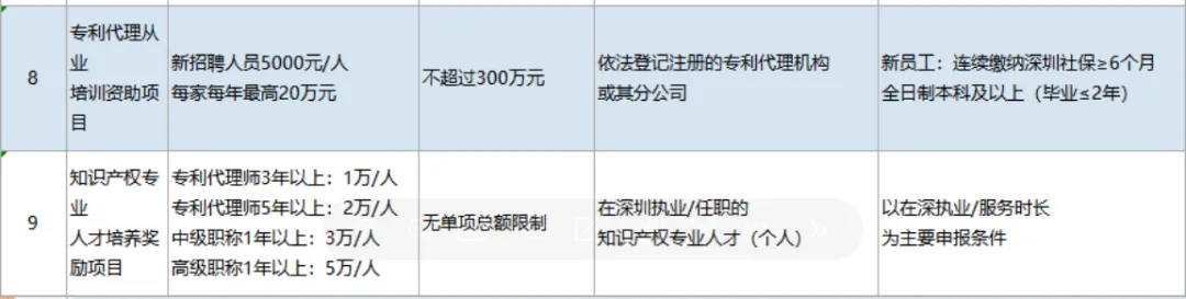 【资助/奖励标准】 专利代理师在深圳执业累计满3年:每人奖励1万元;专利代理师在深圳执业累计满5年:每人奖励2万元;取得知识产权专业中级技术职称且在深服务满1年:每人奖励3万元;取得知识产权专业高级技术职称且在深服务满1年:每人奖励5万元。