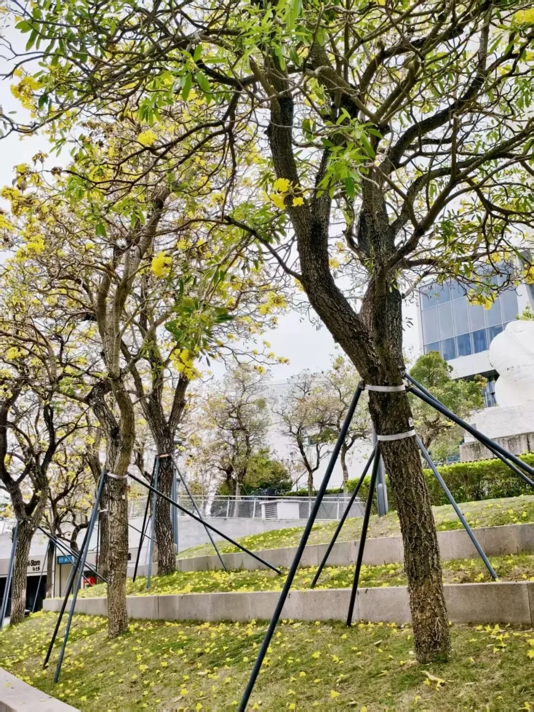 那天去海上世界文化艺术中心开会,一眼就被旁边大片的黄花风铃木吸引了目光。