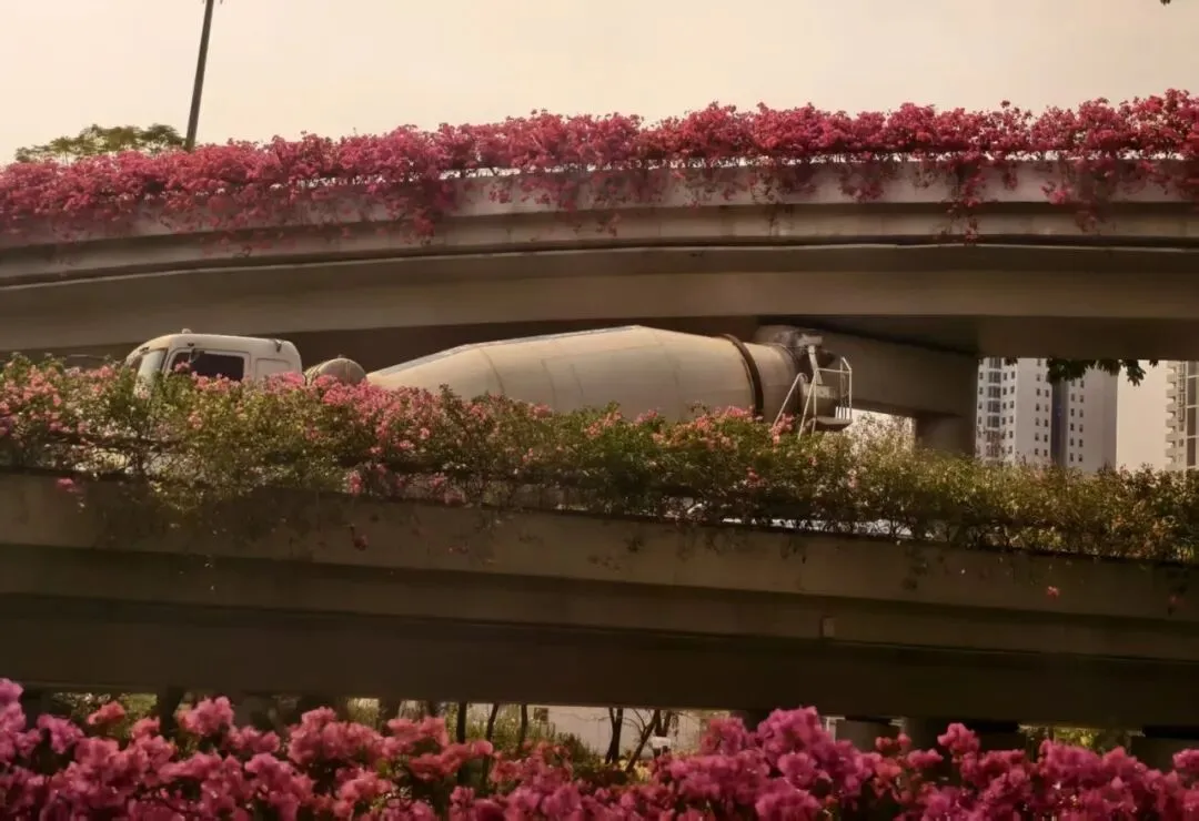 坐上的士回市区,经过南海大道上深大西门的下沉隧道时,隧道侧边整面墙壁被粉色、白色、紫色的宫粉紫荆、勒杜鹃全覆盖,一直垂到隧道底部。我瞬间被这片花墙震惊了!
