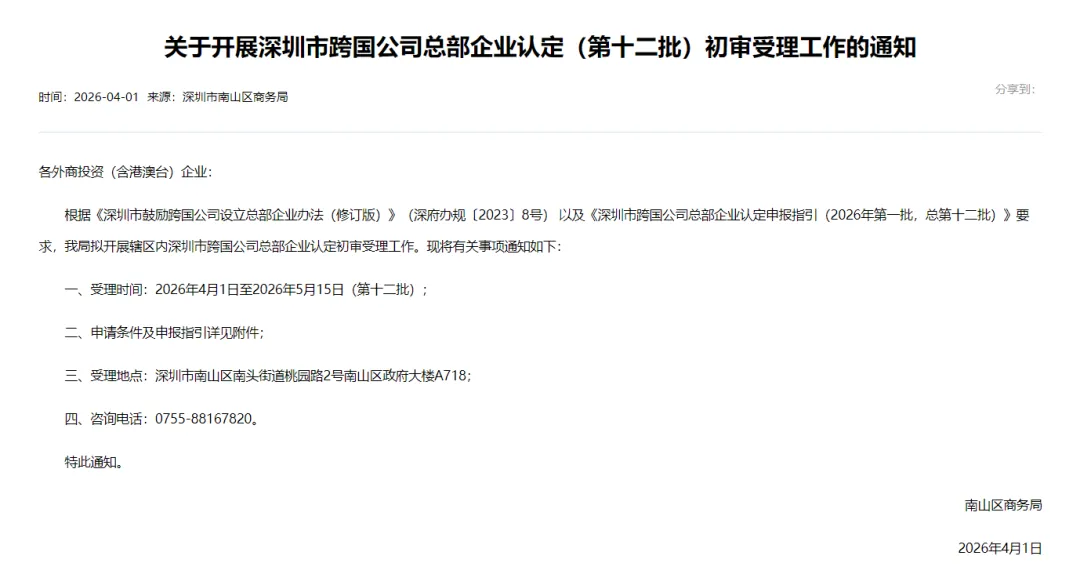 复审通过后将公示并颁发《深圳市跨国公司总部企业认定证书》