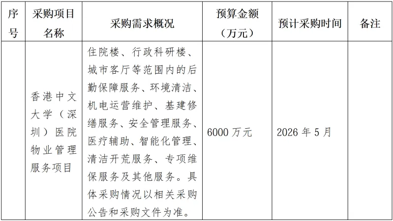 为便于供应商及时了解政府采购信息,根据《财政部关于开展政府采购意向公开工作的通知》(财库〔2020〕10号)等有关规定,现将香港中文大学(深圳)医院物业管理服务项目采购意向公开如下: