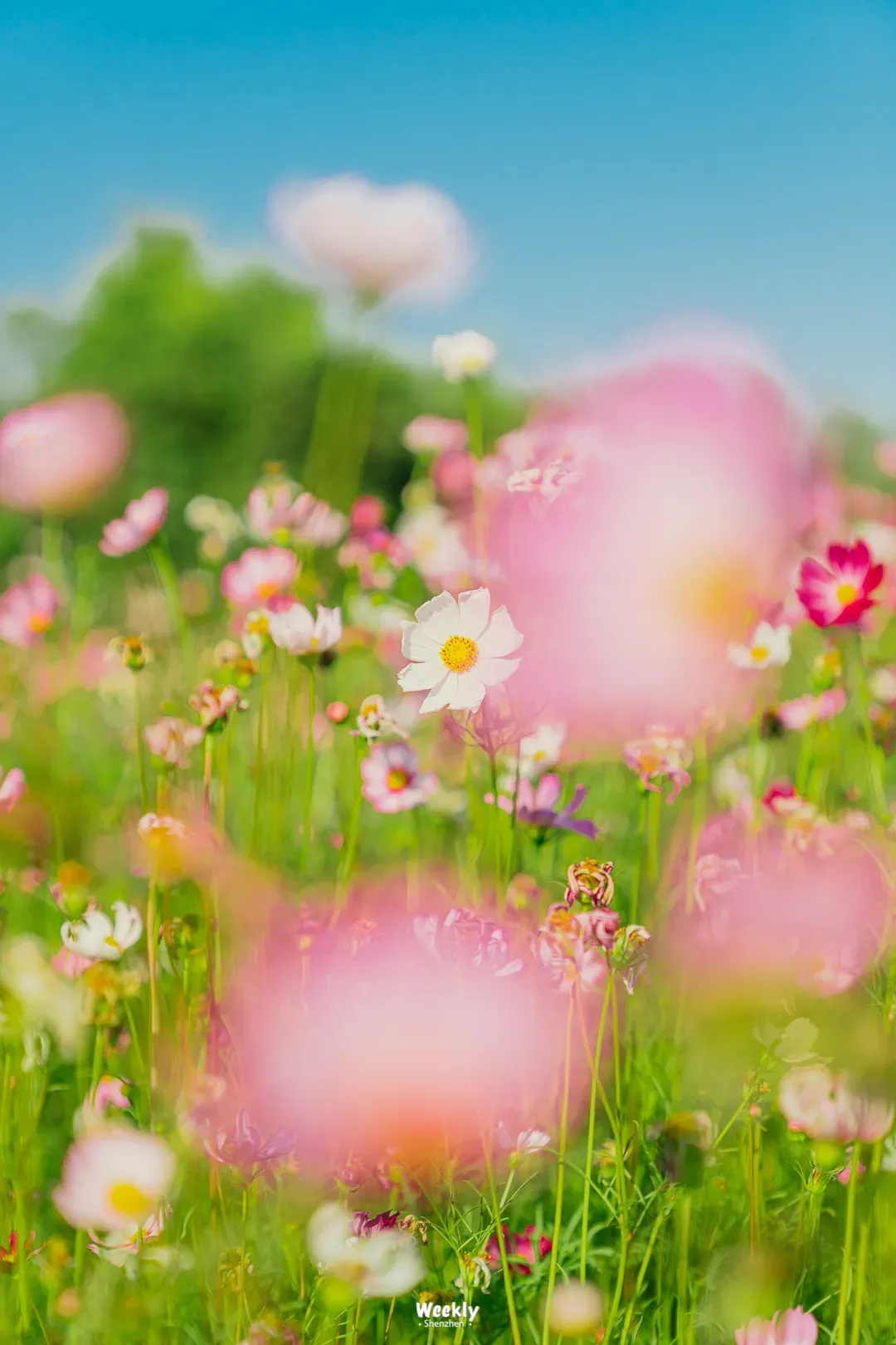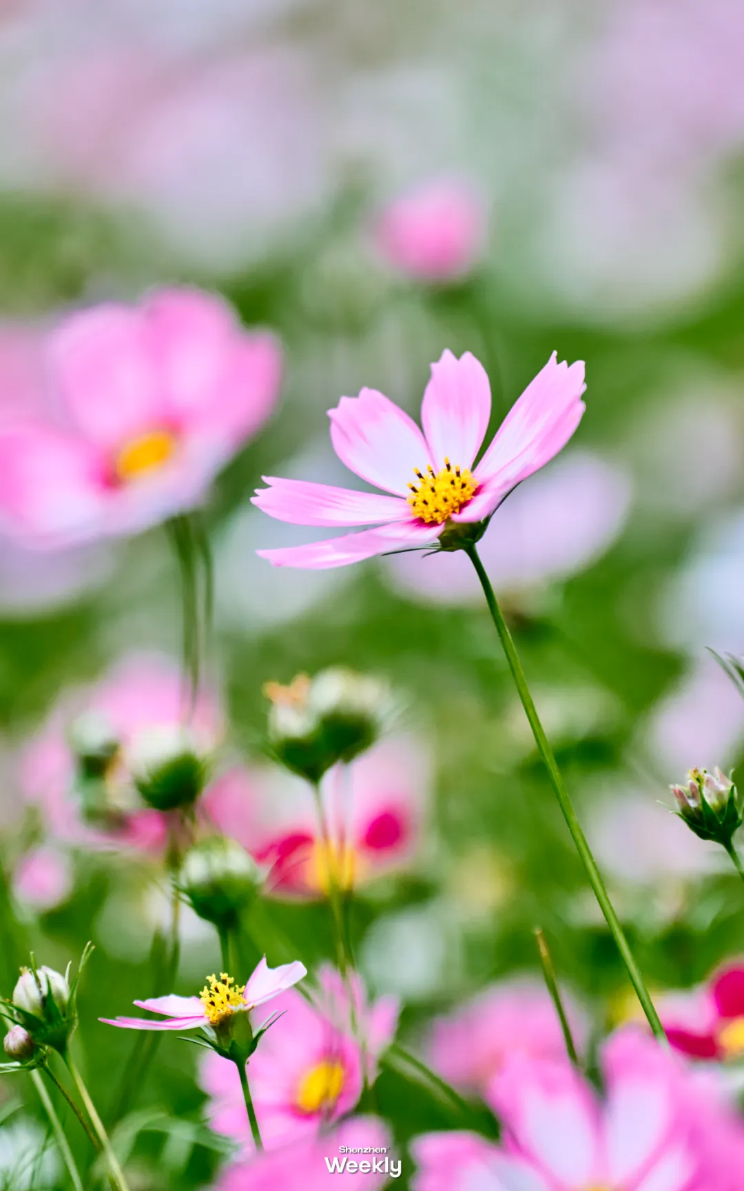 细细观察一番发现,格桑花的花茎细长而挺拔,风一吹像波浪起伏,泛起粉色的浪潮,花朵们轻轻碰撞,发出沙沙的声音,像一场舒服静谧的白噪音,让人不禁沉浸其中。
