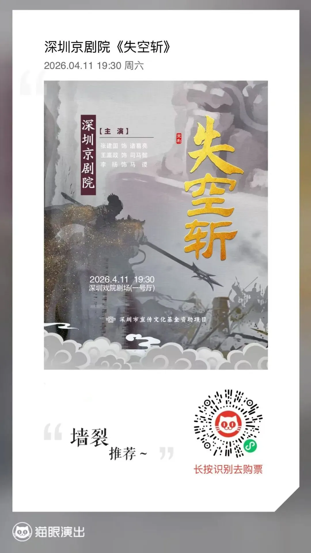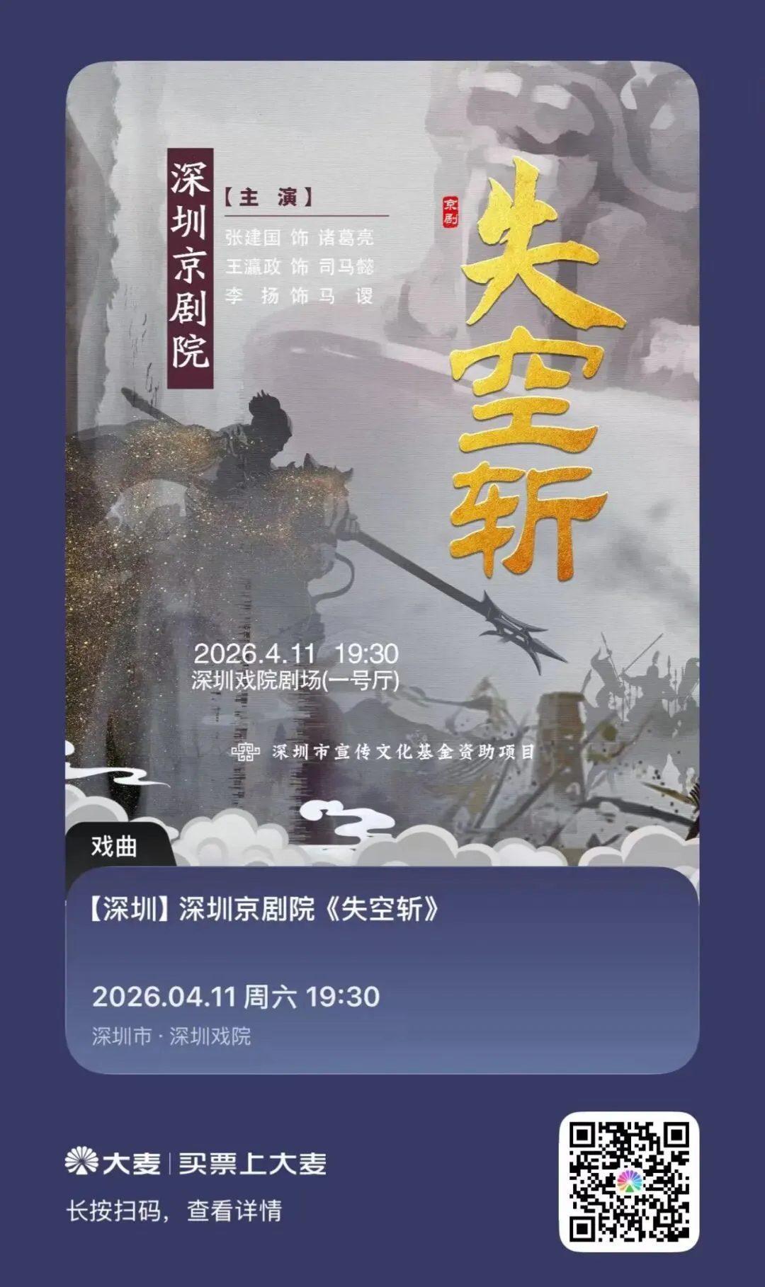 京剧名家张建国领衔,深圳京剧院《失空斩》4月11日好戏上演