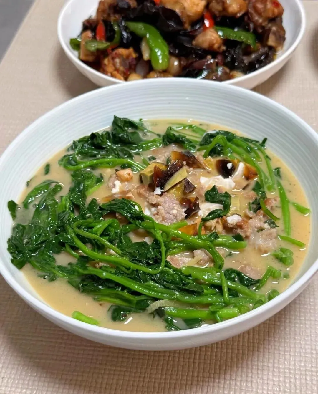 那碗上汤西洋菜最先出圈。汤色奶白里带一点蛋黄的金,西洋菜烫得刚刚好,嫩梗绿得发亮,皮蛋咸鸭蛋碎在肉沫里翻出香气,看着就不是临时拼的,而是认真做过功课的。