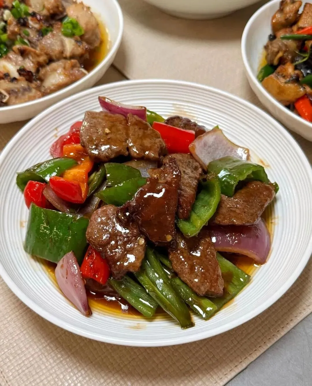 再看黑胡椒牛排。牛肉切块,青红椒和洋葱一起爆香,酱汁勾得亮,颜色很讨喜。它不是那种酒楼里摆盘精致的西餐感,反而很像家里人怕你吃不惯太清淡,特地做一道更下饭、更有冲击感的肉菜。