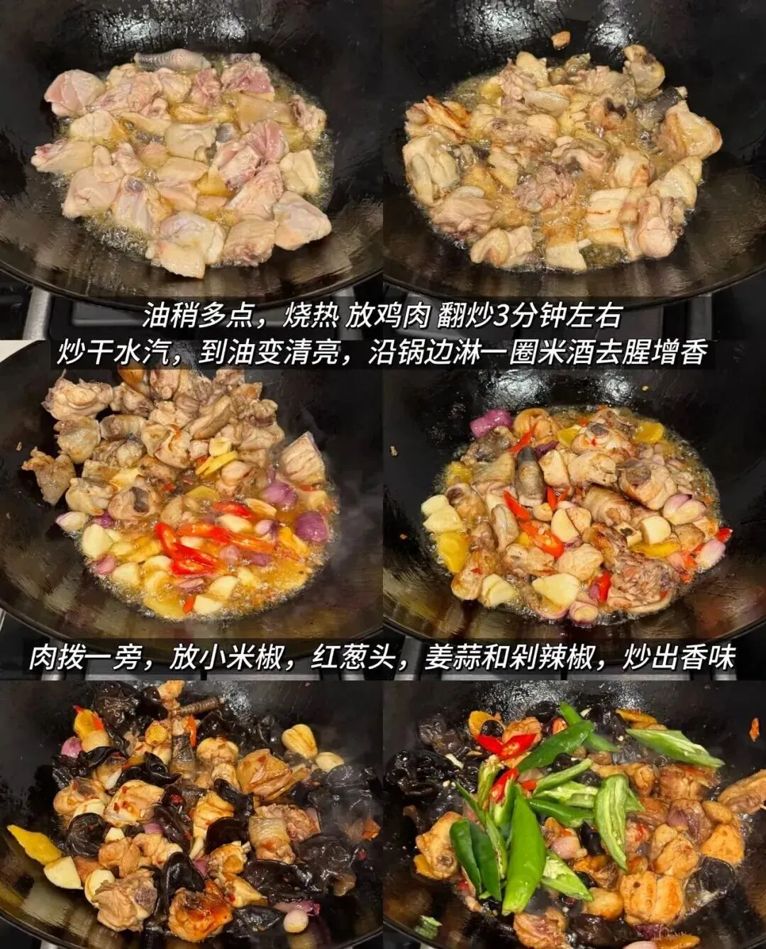 最后那盘鸡,木耳、青椒、红葱头、姜蒜、小米椒全下了锅,颜色杂却热闹,锅气隔着屏幕都能闻到。它甚至不追求精致,就是奔着“香、够味、配饭”去的。